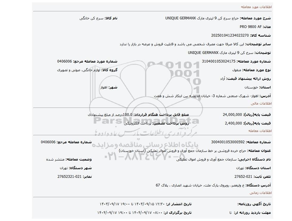 | شماره مورد معامله: 3104001053024175 | شماره مورد معامله مرجع: 0406006 | |