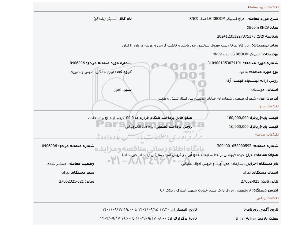 مزایده عمومی مزایده اسپیکر LG XBOOM مدل RNC9 برگزار میگردد. از کلیه افراد متخصص و شرکتهای واجد شرایط دعوت به عمل میآید تا در این مزایده با کد خبرگزاری پارس نماد : 9950632 شرکت نمایند تاریخ شروع مزایده : 1404/09/15 مهلت شرکت در مزایده: تا پایان روز 1404/09/17 مکان برگزاری اموال واگذاری استانهای خوزستان و دستهبندیهای مربوط به این حراجی متفرقه میباشد.