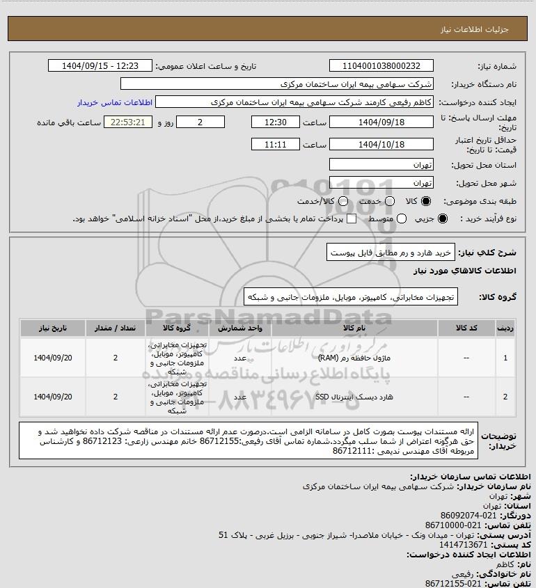 شرح کلی نیاز: خرید هارد و رم مطابق فایل پیوست