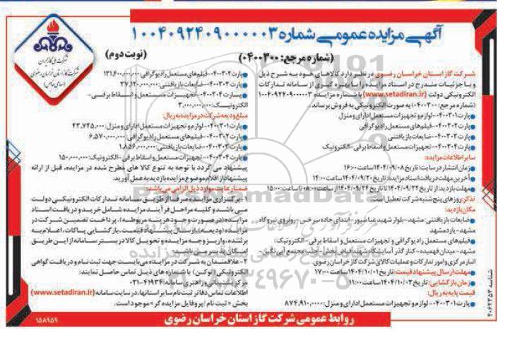 شرکت گاز استان خراسان رضوی در نظر دارد کالاهای خود به شرح ذیل و با جزئیات مندرج در اسناد مزایده را با بهره گیری از سامانه تدارکات الکترونیکی دولت سایت ستاد ایران با شماره مزایده 1004092409000003 (شماره مرجع 0400300 )به صورت الکترونیکی به فروش برساند.