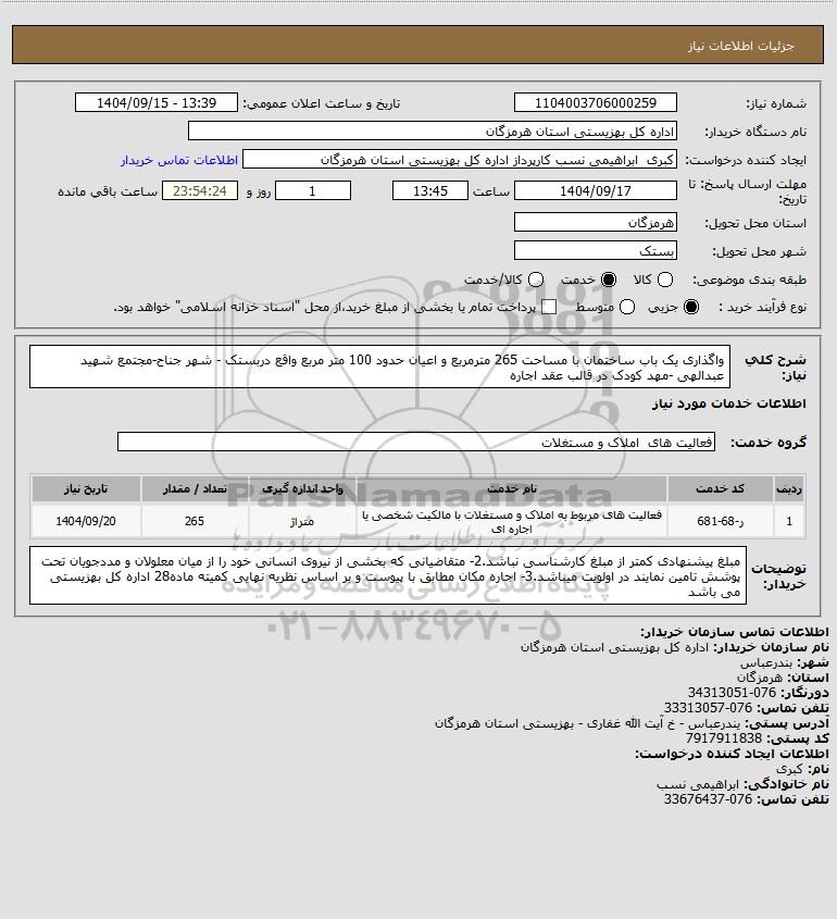شرح کلی نیاز: واگذاری یک باب ساختمان با مساحت 265 مترمربع و اعیان حدود 100 متر مربع واقع دربستک - شهر جناح-مجتمع شهید عبدالهی -مهد کودک در قالب عقد اجاره