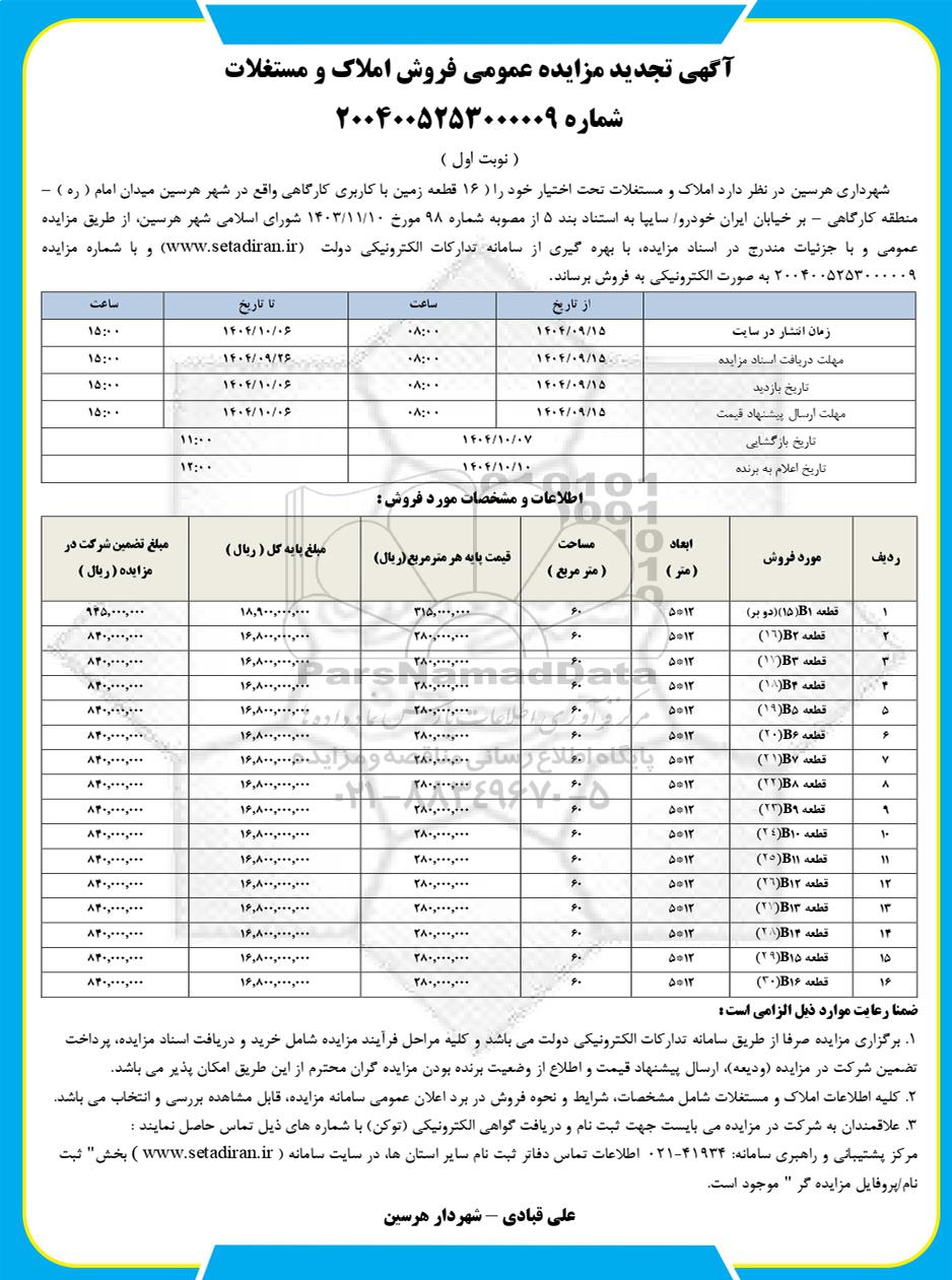 شهرداری هرسین در نظر دارد املاک و مستغلات تحت اختیار خود را 16 قطعه زمین با کاربری کارگاهی واقع در شهر هرسین میدان امام منطقه کارگاهی بر خیابان ایران خودرو / سایپا به استناد بند 5 از مصوبه شماره 98 مورخ 1403.11.10 شورای اسلامی شهر هرسین از طریق مزایده عمومی و با جزییات مندرج در اسناد مزایده با بهره گیری از سامانه تدارکات الکترونیکی دولت و با شماره مزایده 2004005253000009 به صورت الکترونیکی به فروش برساند