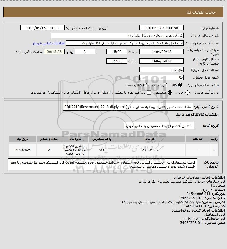 شرح کلی نیاز: نشان دهنده دیجیتالی مربوط به سطح سنج(RDU2210)Rosemount 2210 disply unit