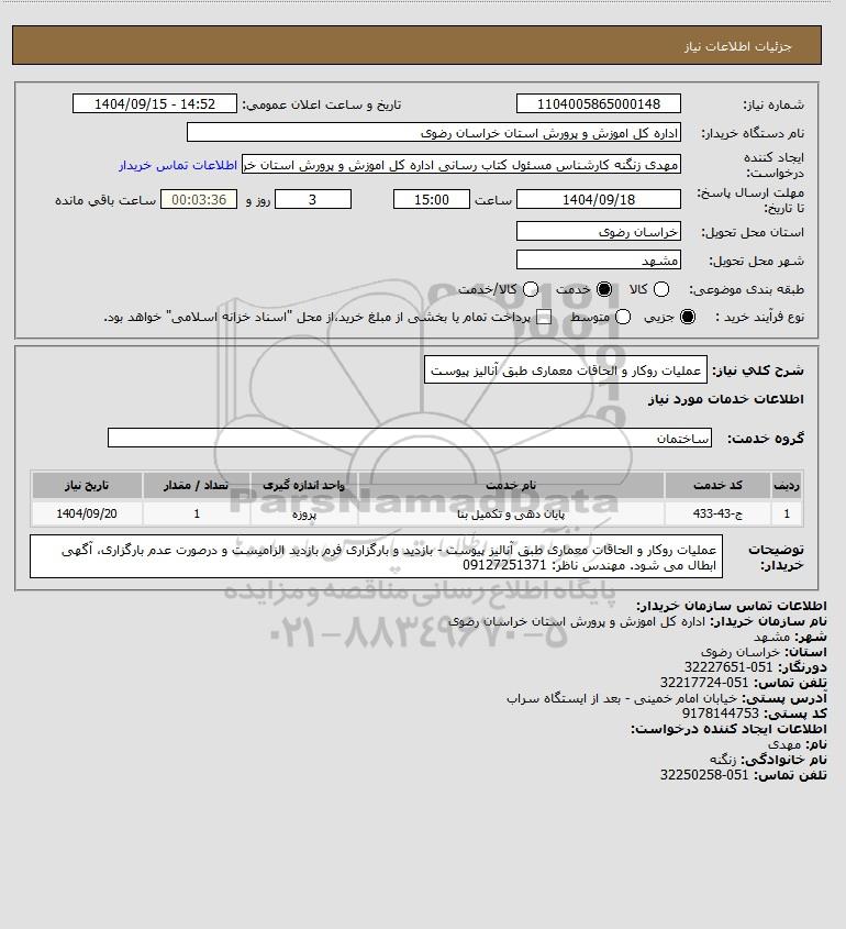 توضیحات خریدار:عملیات روکار و الحاقات معماری طبق آنالیز پیوست - بازدید و بارگزاری فرم بازدید الزامیست و درصورت عدم بارگزاری، آگهی ابطال می شود. مهندس ناظر: 09127251371