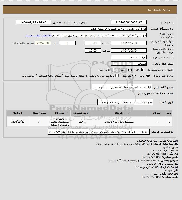 1 -- سیستم پایش آب و فاضلاب عدد تجهیزات شستشو، نظافت، پاکسازی و تصفیه 1 1404/09/20