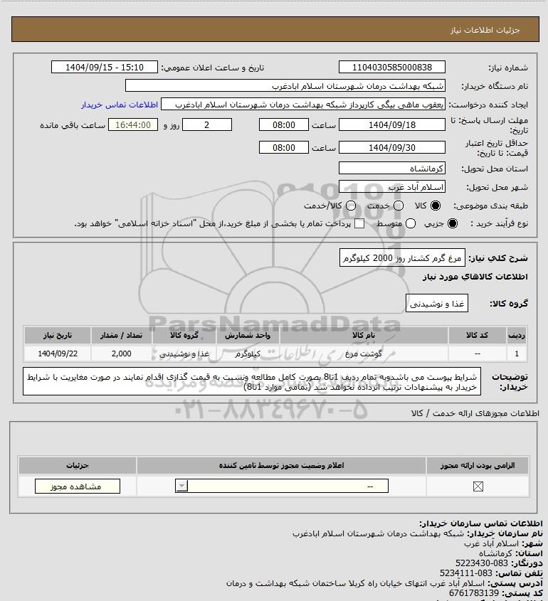 شرح کلی نیاز: مرغ گرم کشتار روز 2000 کیلوگرم