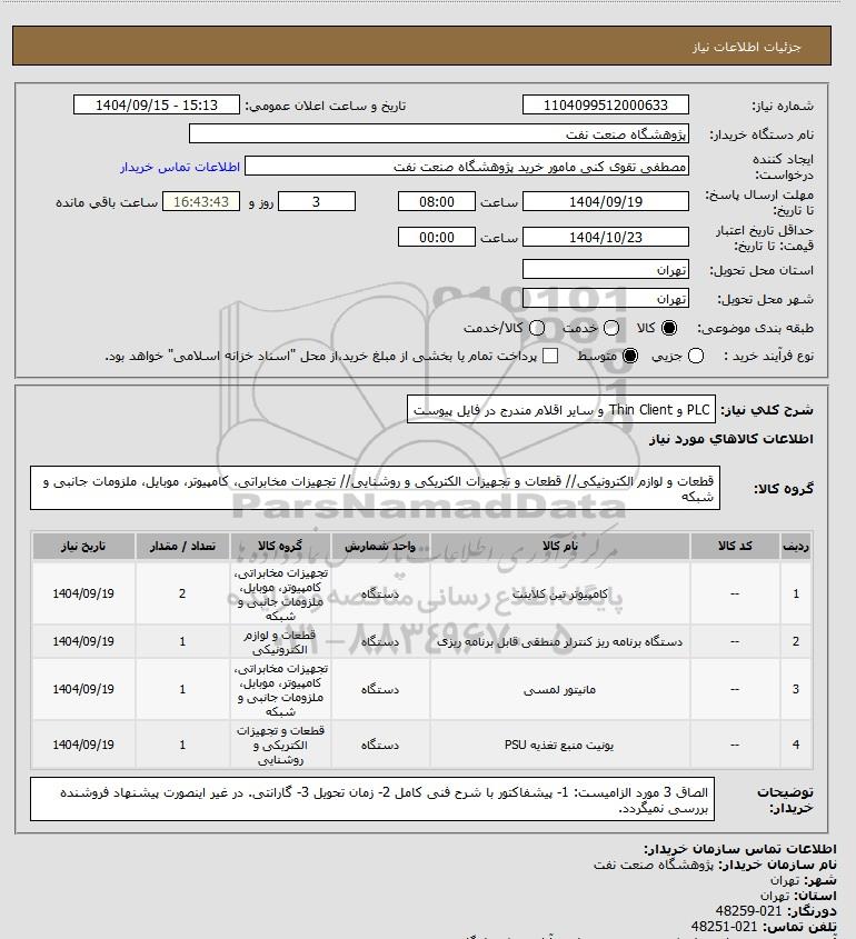 شرح کلی نیاز: PLC و Thin Client و سایر اقلام مندرج در فایل پیوست