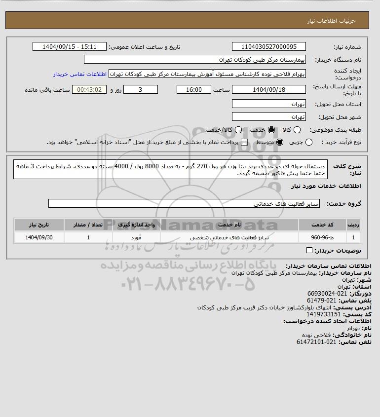 شرح کلی نیاز: دستمال حوله ای دو عددی برند بیتا وزن هر رول 270 گرم - به تعداد 8000 رول / 4000 بسته دو عددی. شرایط پرداخت 3 ماهه حتما حتما پیش فاکتور ضمیمه گردد.