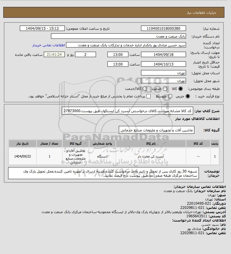 شرح کلی نیاز: کد کالا مشابه میباشد.کالای درخواستی آبسرد کن ایستکول طبق پیوست.27873000