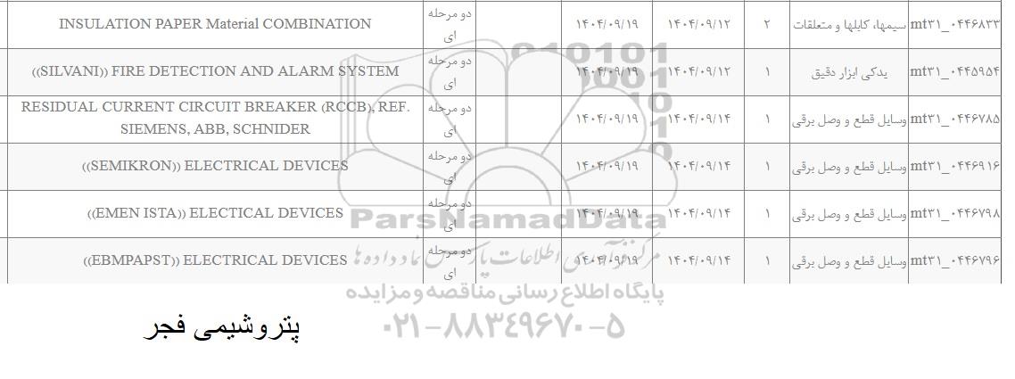 | mt31-0446798 | وسایل قطع و وصل برقی | 1 | 1404.9.14 | 1404.9.19 | دو مرحله ای | ((EMEN ISTA)) ELECTICAL DEVICES |