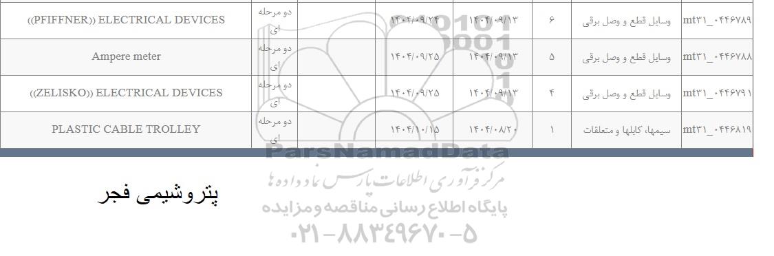 | m31-0446788 | وسایل قطع و وصل برقی | 5 | 1404.9.13 | 1404.9.25 | دو مرحله ای | Ampere meter |