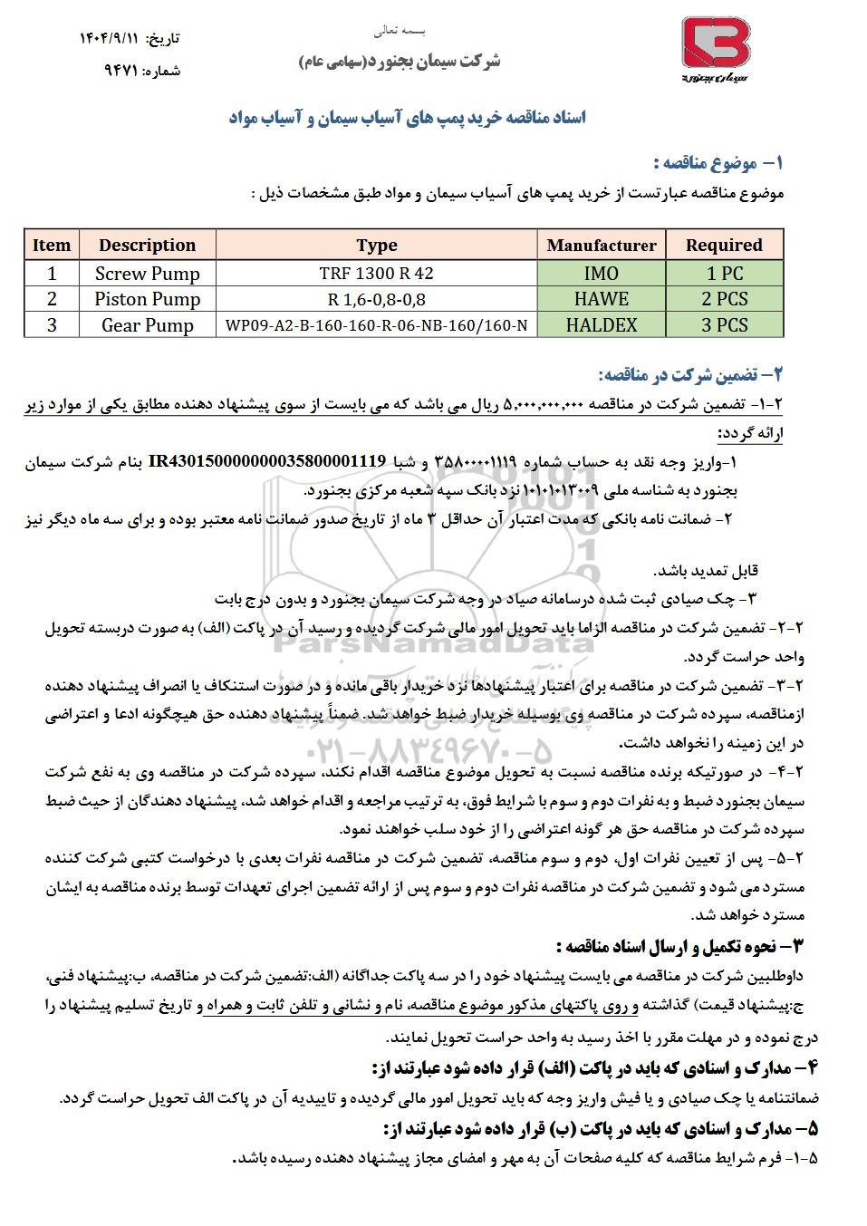 مناقصه خرید پمپ های آسیاب سیمان و آسیاب مواد از کلیه افراد متخصص و شرکتها واجد شرایط دعوت به عمل میآید در مناقصه با کد خبرگزاری پارس نماد: 9951760 شرکت نمایند.