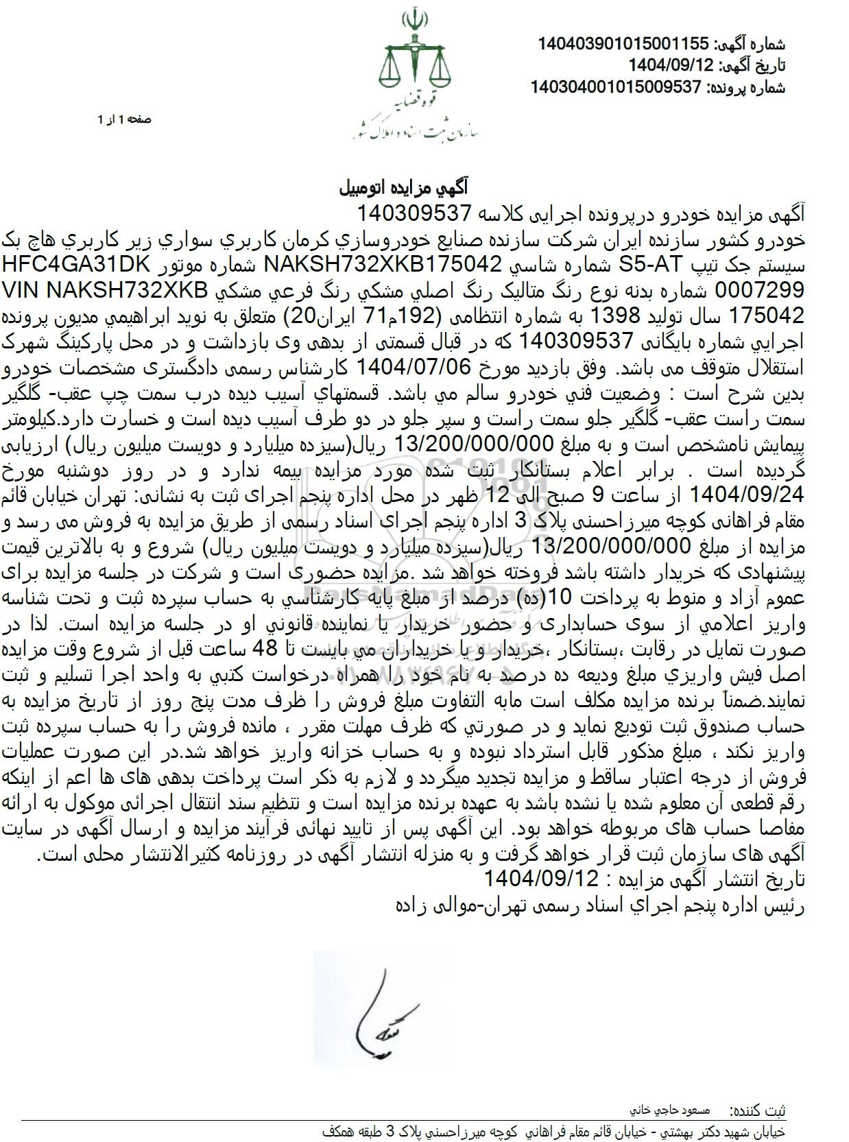 خودرو کشور سازنده ایران شرکت سازنده صنایع خودروسازی کرمان کاربری سواری زیر کاربری هاچ بک HFC4GA31DK شماره موتور NAKSH732XKB175042 شماره شاسی S5-AT سیستم جک تیپ 0007299 شماره بدنه نوع رنگ متالیک رنگ اصلی مشکی رنگ فرعی مشکی VIN NAKSH732XKB 175042 سال تولید 1398 به شماره انتظامی 192م 71) ایران (20) متعلق به نوید ابراهیمی مدیون پرونده اجرایی شماره بایگانی 140309537 که در قبال قسمتی از بدهی وی بازداشت و در محل پارکینگ شهرک استقلال متوقف میباشد وفق بازدید مورخ 1404.07.06 کارشناس رسمی دادگستری مشخصات خودرو بدین شرح است: وضعیت فنی خودرو سالم می باشد. قسمتهای آسیب دیده درب سمت چپ عقب گلگیر سمت راست عقب گلگیر جلو سمت راست و سپر جلو در دو طرف آسیب دیده است و خسارت دارد. کیلومتر پیمایش نامشخص است و به مبلغ 13.200.000.000 ریال سیزده میلیارد و دویست میلیون ریال ارزیابی گردیده است. برابر اعلام بستانکار ثبت شده مورد مزایده بیمه ندارد و در روز دوشنبه مورخ 1404.09.24 از ساعت 9 صبح الى 12 ظهر در محل اداره پنجم اجرای ثبت به نشانی تهران خیابان قائم مقام فراهانی کوچه میرزاحسنی پلاک 3 اداره پنجم اجرای اسناد رسمی از طریق مزایده به فروش می رسد و مزایده از مبلغ 13.200.000.000 ریال سیزده میلیارد و دویست میلیون ریال شروع و به بالاترین قیمت پیشنهادی که خریدار داشته باشد فروخته خواهد شد. مزایده حضوری است و شرکت در جلسه مزایده برای عموم آزاد و منوط به پرداخت 10 (ده) درصد از مبلغ پایه کارشناسی به حساب سپرده ثبت و تحت شناسه واریز اعلامی از سوی حسابداری و حضور خریدار یا نماینده قانونی او در جلسه مزایده است. لذا در صورت تمایل در رقابت ، بستانکار خریدار و یا خریداران می بایست تا 48 ساعت قبل از شروع وقت مزایده اصل فیش واریزی مبلغ ودیعه ده درصد به نام خود را همراه درخواست کتبی به واحد اجرا تسلیم و ثبت نمایند. ضمناً برنده مزایده مکلف است ما به التفاوت مبلغ فروش را ظرف مدت پنج روز از تاریخ مزایده به حساب صندوق ثبت تودیع نماید و در صورتی که ظرف مهلت مقرر، مانده فروش را به حساب سپرده ثبت واریز نکند ، مبلغ مذکور قابل استرداد نبوده و به حساب خزانه واریز خواهد شد. در این صورت عملیات فروش از درجه اعتبار ساقط و مزایده تجدید میگردد و لازم به ذکر است پرداخت بدهی های ها اعم از اینکه رقم قطعی آن معلوم شده یا نشده باشد به عهده برنده مزایده است و تنظیم سند انتقال اجرائی موکول به ارائه مفاصا حسابهای مربوطه خواهد بود این آگهی پس از تایید نهایی فرآیند مزایده و ارسال آگهی در سایت آگهی های سازمان ثبت قرار خواهد گرفت و به منزله انتشار آگهی در روزنامه کثیر الانتشار محلی است. 1404.09.12