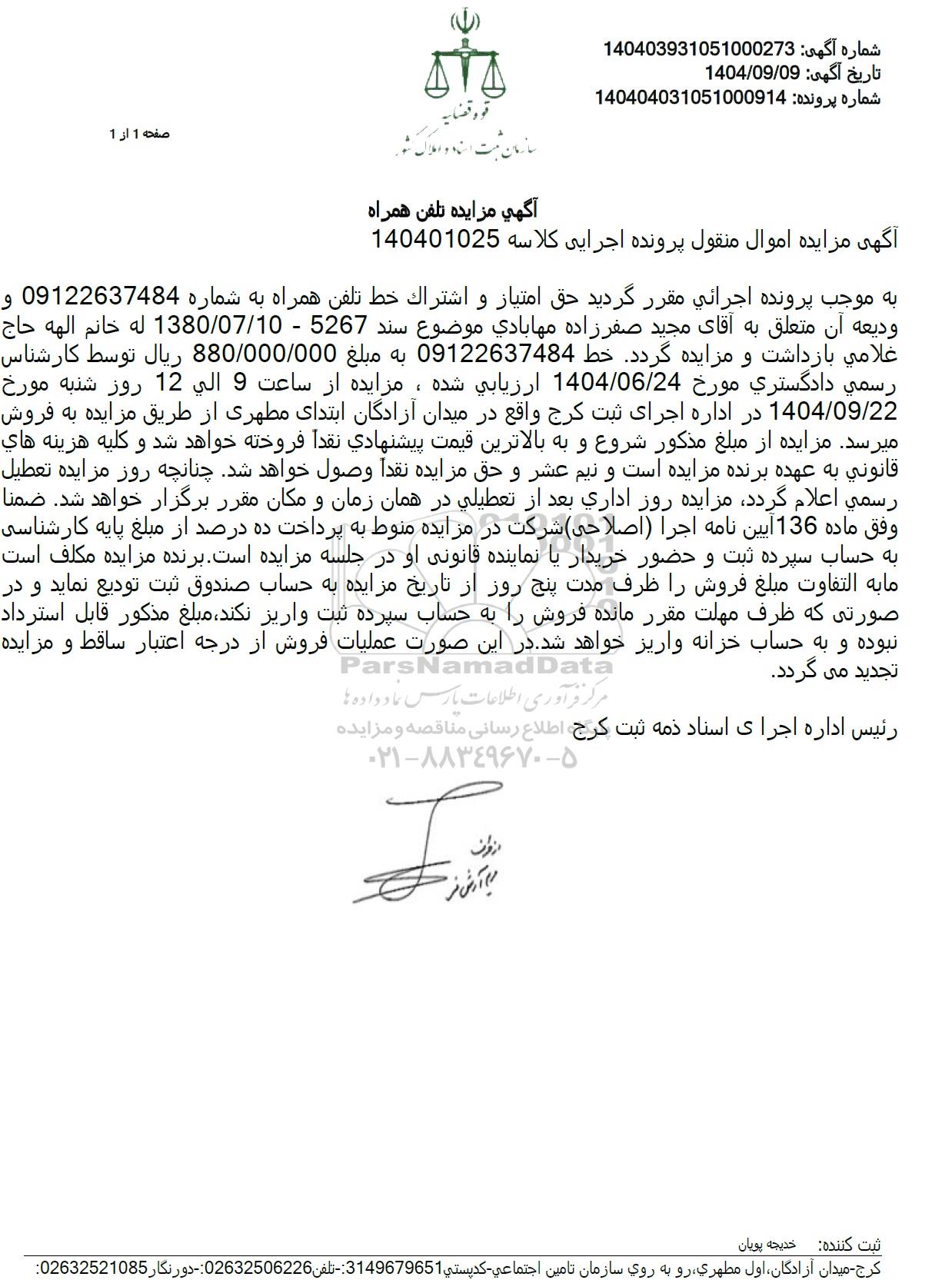 به موجب پرونده اجرائی مقرر گردید حق امتیاز و اشتراک خط تلفن همراه به شماره 09122637484 و ودیعه آن متعلق به آقای مجید صفرزاده مهابادي موضوع سند 5267 - 1380.07.10 له خانم الهه حاج غلامی بازداشت و مزایده گردد خط 09122637484 به مبلغ 880.000.000 ریال توسط کارشناس رسمی دادگستري مورخ 1404.06.24 ارزیابی شده، مزایده از ساعت 9 الی 12 روز شنبه مورخ 1404.09.22 در اداره اجرای ثبت کرج واقع در میدان آزادگان ابتدای مطهری از طریق مزایده به فروش میرسد. مزایده از مبلغ مذکور شروع و به بالاترین قیمت پیشنهادی نقدا فروخته خواهد شد و کلیه هزینه هاي قانوني به عهده برنده مزایده است و نیم عشر و حق مزایده نقداً وصول خواهد شد. چنانچه روز مزایده تعطیل رسمی اعلام گردد مزایده روز اداری بعد از تعطیلی در همان زمان و مکان مقرر برگزار خواهد شد. ضمنا وفق ماده 136 آیین نامه اجرا (اصلاحی) شرکت در مزایده منوط به پرداخت ده درصد از مبلغ پایه کارشناسی به حساب سپرده ثبت و حضور خریدار یا نماینده قانونی او در جلسه مزایده است. برنده مزایده مکلف است. مابه التفاوت مبلغ فروش را ظرف مدت پنج روز از تاریخ مزایده به حساب صندوق ثبت تودیع نماید و در صورتی که ظرف مهلت مقرر مانده فروش را به حساب سپرده ثبت واریز نکند مبلغ مذکور قابل استرداد نبوده و به حساب خزانه واریز خواهد شد. در این صورت عملیات فروش از درجه اعتبار ساقط و مزایده تجدید می گردد.