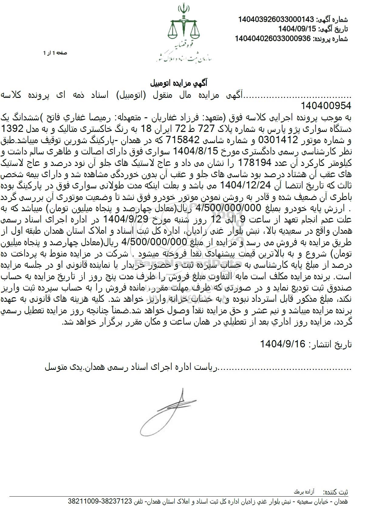 آگهی مزایده مال منقول (اتومبیل) اسناد ذمه ای پرونده کلاسه 140400954 به موجب پرونده اجرایی کلاسه فوق متعهد فرزاد غفاریان - متعهدله رمیصا غفاری فاتح ششدانگ یک دستگاه سواری پژو پارس به شماره پلاک 727 ط 72 ایران 18 به رنگ خاکستری متالیک و به مدل 1392 و شماره موتور 0301412 و شماره شاسی 715842 که در همدان پارکینگ شورین توقیف میباشد. طبق نظر کارشناسی رسمی دادگستری مورخ 1404.8.15 سواری فوق دارای اصالت و ظاهری سالم داشت و کیلومتر کارکرد آن عدد 178194 را نشان می داد و عاج لاستیکهای جلو آن نود درصد و عاج لاستیک های عقب آن هشتاد درصد بود شاسی های جلو و عقب آن بدون خوردگی مشاهده شد و دارای بیمه شخص ثالث که تاریخ انتضا آن 1404.12.24 می باشد و بعلت اینکه مدت طولانی سواری فوق در پارکینگ بوده باطری آن ضعیف شده و قادر به روشن نمودن موتور خودرو فوق نشد تا وضعیت موتوری آن بررسی گردد . ارزش پایه خودرو بمبلغ 4.500.000.000 ریال معادل چهارصد و پنجاه میلیون تومان میباشد که به علت عدم انجام تعهد از ساعت 9 الی 12 روز شنبه مورخ 1404.9.29 در اداره اجرای اسناد رسمی همدان واقع در سعیدیه بالا نبش بلوار غنی زادیان اداره کل ثبت اسناد و املاک استان همدان طبقه اول از طریق مزایده به فروش میرسد و مزایده از مبلغ 4.500.000.000 ریال معادل چهارصد و پنجاه میلیون تومان شروع و به بالاترین قیمت پیشنهادی نقدا فروخته میشود . شرکت در مزایده منوط به پرداخت ده درصد از مبلغ پایه کارشناسی به حساب سپرده ثبت و حضور خریدار یا نماینده قانونی او در جلسه مزایده است. برنده مزایده مکلف است ما به التفاوت مبلغ فروش را ظرف مدت پنج روز از تاریخ مزایده به حساب صندوق ثبت تودیع نماید و در صورتی که ظرف مهلت مقرر مانده فروش را به حساب سپرده ثبت واریز نکند، مبلغ مذکور قابل استرداد نبوده و به حساب خزانه واریز خواهد شد کلیه هزینه های قانونی به عهده برنده مزایده میباشد و نیم عشر و حق مزایده نقداً وصول خواهد شد. ضمنا چنانچه روز مزایده تعطیل رسمی گردد مزایده روز اداری بعد از تعطیلی در همان ساعت و مکان مقرر برگزار خواهد شد.