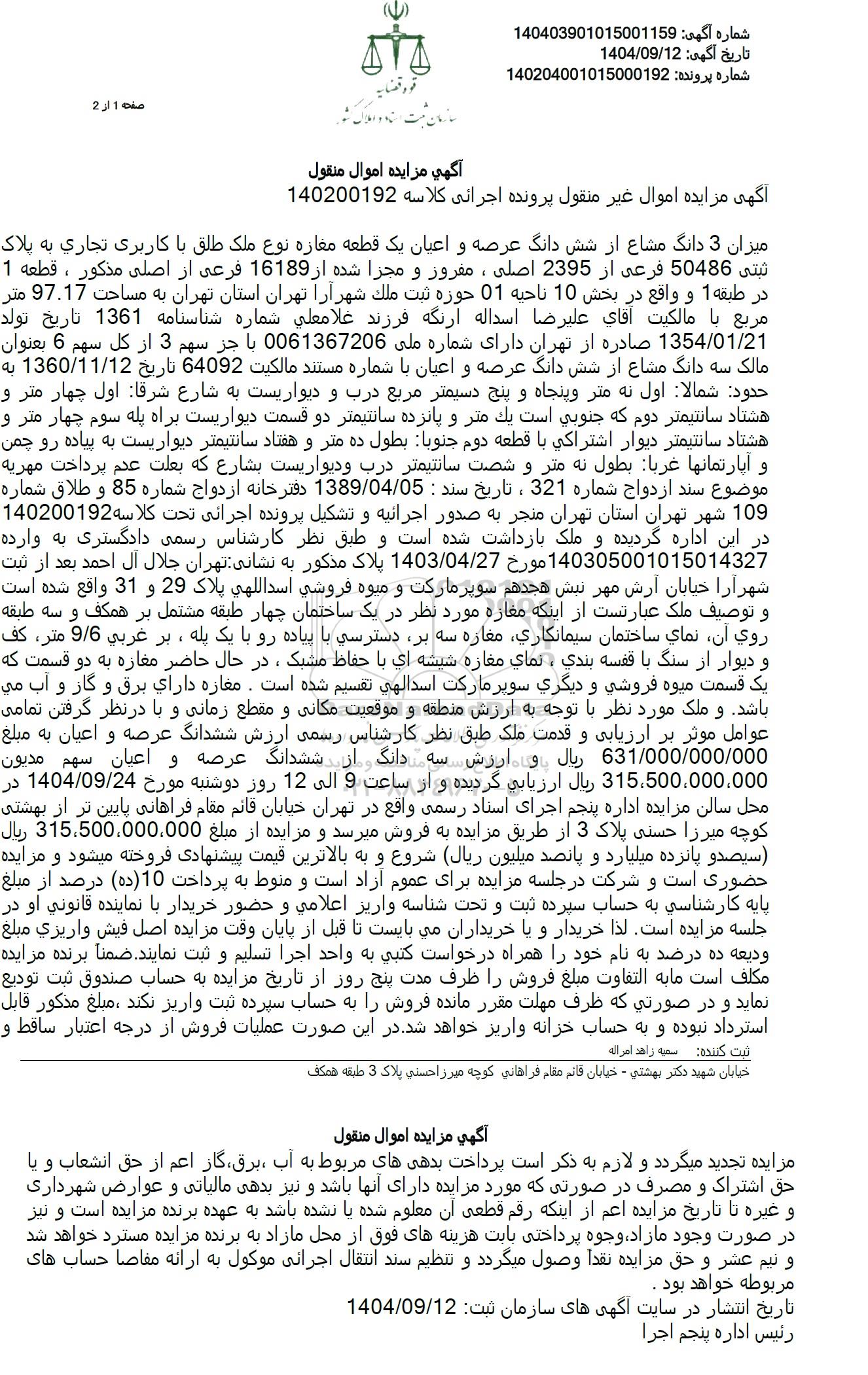 میزان 3 دانگ مشاع از شش دانگ عرصه و اعیان یک قطعه مغازه نوع ملک طلق با کاربری تجاری به پلاک ثبتی 50486 فرعی از 2395 اصلی، مفروز و مجزا شده از 16189 فرعی از اصلی مذکور ، قطعه 1 در طبقه 1 و واقع در بخش 10 ناحیه 01 حوزه ثبت ملک شهر ارا تهران استان تهران به مساحت 97.17 متر مربع با مالکیت آقای علیرضا اسداله ارنگه فرزند غلامعلی شماره شناسنامه 1361 تاریخ تولد 1354.01.21 صادره از تهران دارای شماره ملی 0061367206 با جز سهم 3 از کل سهم 6 بعنوان مالک سه دانگ مشاع از شش دانگ عرصه و اعیان با شماره مستند مالکیت 64092 تاریخ 1360.11.12 به حدود شمالا اول نه متر وپنجاه و پنج دسیمتر مربع درب و دیواریست به شارع شرقا اول چهار متر و هشتاد سانتیمتر دوم که جنوبی است یک متر و پانزده سانتیمتر دو قسمت دیواریست براه پله سوم چهار متر و هشتاد سانتیمتر دیوار اشتراکی با قطعه دوم جنوبا بطول ده متر و هفتاد سانتیمتر دیواریست به پیاده رو چمن و آپارتمانها غربا بطول نه متر و شصت سانتیمتر درب و دیواریست بشارع که بعلت عدم پرداخت مهریه موضوع سند ازدواج شماره 321 ، تاریخ سند : 1389.04.05 دفترخانه ازدواج شماره 85 و طلاق شماره 109 شهر تهران استان تهران منجر به صدور اجرائیه و تشکیل پرونده اجرائی تحت کلاسه 140200192 در این اداره گردیده و ملک بازداشت شده است و طبق نظر کارشناس رسمی دادگستری به وارده 140305001015014327 مورخ 1403.04.27 پلاک مذکور به نشانی تهران جلال آل احمد بعد از ثبت شهر ا را خیابان آرش مهر نبش هجدهم سوپر مارکت و میوه فروشی اسداللهی پلاک 29 و 31 واقع شده است. و توصیف ملک عبارتست از اینکه مغازه مورد نظر در یک ساختمان چهار طبقه مشتمل بر همکف و سه طبقه روی آن نمای ساختمان سیمانکاری مغازه سه بر دسترسی با پیاده رو با یک پله ، بر غربی 9.6 متر، کف و دیوار از سنگ با قفسه بندی ، نمای مغازه شیشه ای با حفاظ مشبک، در حال حاضر مغازه به دو قسمت که یک قسمت میوه فروشی و دیگری سوپر مارکت اسدالهی تقسیم شده است. مغازه دارای برق و گاز و آب می باشد و ملک مورد نظر با توجه به ارزش منطقه و موقعیت مکانی و مقطع زمانی و با در نظر گرفتن تمامی عوامل موثر بر ارزیابی و قدمت ملک طبق نظر کارشناس رسمی ارزش ششدانگ عرصه و اعیان به مبلغ 631.000.000.000 ریال و ارزش سه دانگ از ششدانگ عرصه و اعیان سهم مدیون 315.500.000.000 ریال ارزیابی گردیده و از ساعت 9 الی 12 روز دوشنبه مورخ 1404.09.24 در محل سالن مزایده اداره پنجم اجرای اسناد رسمی واقع در تهران خیابان قائم مقام فراهانی پایین تر از بهشتی کوچه میرزا حسنی پلاک 3 از طریق مزایده به فروش میرسد و مزایده از مبلغ 315.500.000.000  ریال سیصد و پانزده میلیارد و پانصد میلیون ریال شروع و به بالاترین قیمت پیشنهادی فروخته میشود و مزایده حضوری است و شرکت در جلسه مزایده برای عموم آزاد است و منوط به پرداخت 10 ده درصد از مبلغ پایه کارشناسی به حساب سپرده ثبت و تحت شناسه واریز اعلامی و حضور خریدار با نماینده قانونی او در جلسه مزایده است. لذا خریدار و یا خریداران می بایست تا قبل از پایان وقت مزایده اصل فیش واریزی مبلغ ودیعه ده درصد به نام خود را همراه درخواست کتبی به واحد اجرا تسلیم و ثبت نمایند. ضمنا برنده مزایده مکلف است ما به التفاوت مبلغ فروش را ظرف مدت پنج روز از تاریخ مزایده به حساب صندوق ثبت تودیع نماید و در صورتی که ظرف مهلت مقرر مانده فروش را به حساب سپرده ثبت واریز نکند ، مبلغ مذکور قابل استرداد نبوده و به حساب خزانه واریز خواهد شد. در این صورت عملیات فروش از درجه اعتبار ساقط و مزایده تجدید میگردد و لازم به ذکر است پرداخت بدهیهای مربوط به آب برق گاز اعم از حق انشعاب و یا حق اشتراک و مصرف در صورتی که مورد مزایده دارای آنها باشد و نیز بدهی مالیاتی و عوارض شهرداری و غیره تا تاریخ مزایده اعم از اینکه رقم قطعی آن معلوم شده یا نشده باشد به عهده برنده مزایده است و نیز در صورت وجود مازاد وجوه پرداختی بابت هزینه های فوق از محل مازاد به برنده مزایده مسترد خواهد شد. و نیم عشر و حق مزایده نقدا وصول میگردد و تنظیم سند انتقال اجرائی موک