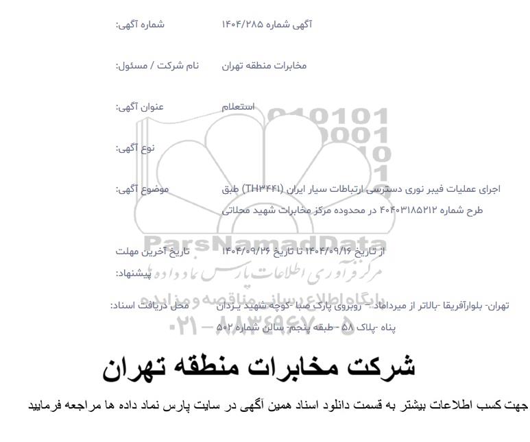 موضوع آگهی: اجرای عملیات فیبر نوری دسترسی ارتباطات سیار ایران (TH3441) طبق طرح شماره 40403185212 در محدوده مرکز مخابرات شهید محلاتی
