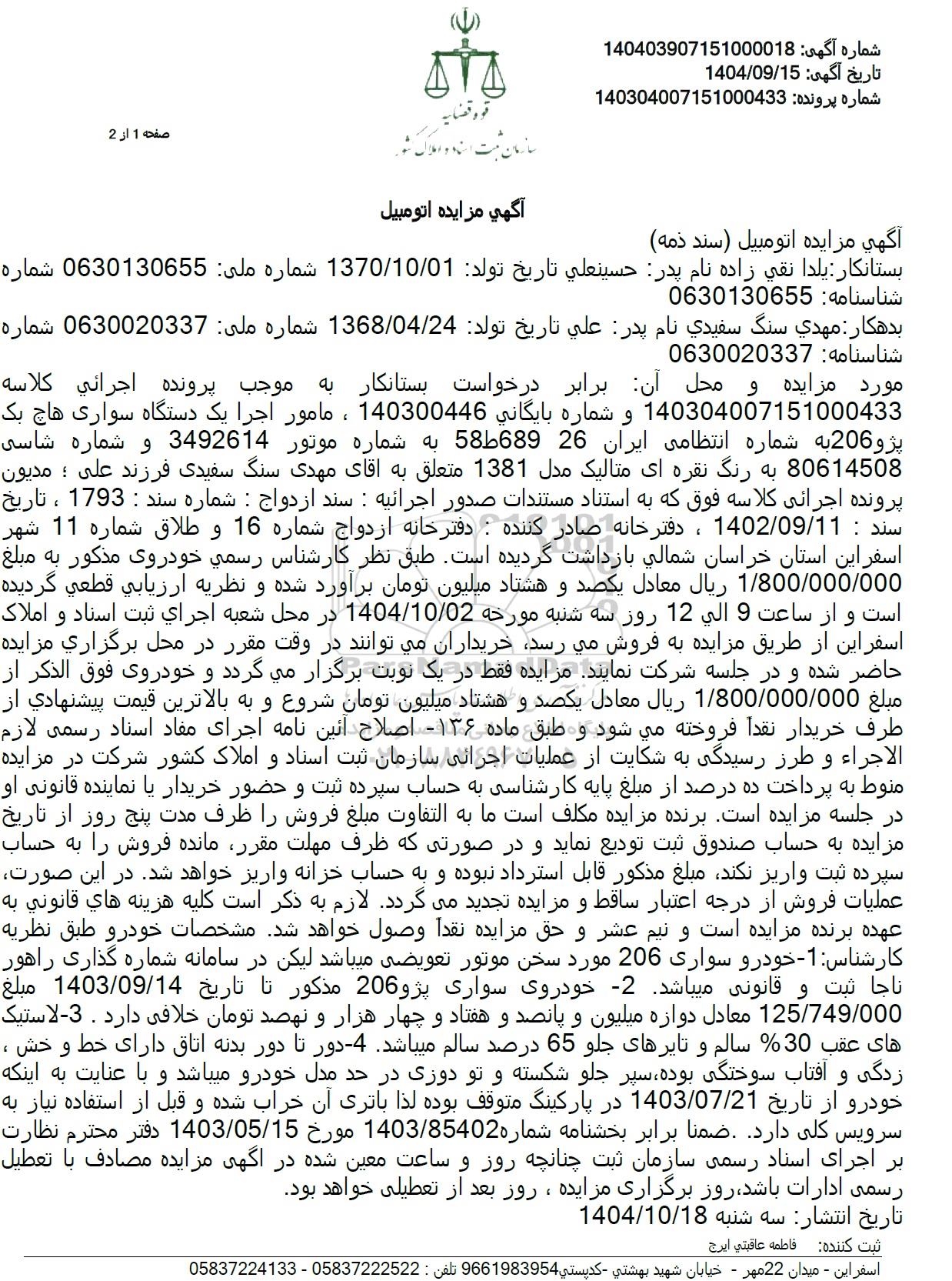 مورد مزایده و محل آن برابر درخواست بستانکار به موجب پرونده اجرائی کلاسه 140304007151000433 و شماره بایگانی 140300446 ، مامور اجرا یک دستگاه سواری هاچ بک پژو 206 به شماره انتظامی ایران 26 58689 به شماره موتور 3492614 و شماره شاسی 80614508 به رنگ نقره ای متالیک مدل 1381 متعلق به آقای مهدی سنگ سفیدی فرزند علی ؛ مدیون پرونده اجرائی کلاسه فوق که به استناد مستندات صدور اجرائیه : سند ازدواج : شماره سند : 1793 ، تاریخ سند : 1402.09.11، دفترخانه صادر کننده : دفترخانه ازدواج شماره 16 و طلاق شماره 11 شهر اسفراین استان خراسان شمالی بازداشت گردیده است. طبق نظر کارشناس رسمی خودروی مذکور به مبلغ 1.800.000.000 ریال معادل یکصد و هشتاد میلیون تومان برآورد شده و نظریه ارزیابی قطعی گردیده است و از ساعت 9 الی 12 روز سه شنبه مورخه 1404.10.02 در محل شعبه اجرای ثبت اسناد و املاک اسفراین از طریق مزایده به فروش میرسد خریداران میتوانند در وقت مقرر در محل برگزاری مزایده حاضر شده و در جلسه شرکت نمایند مزایده فقط در یک نوبت برگزار میگردد و خودروی فوق الذکر از مبلغ 1.800.000.000 ریال معادل یکصد و هشتاد میلیون تومان شروع و به بالاترین قیمت پیشنهادی از طرف خریدار نقداً فروخته میشود و طبق ماده 136 اصلاح آئین نامه اجرای مفاد اسناد رسمی لازم الاجراء و طرز رسیدگی به شکایت از عملیات اجرائی سازمان ثبت اسناد و املاک کشور شرکت در مزایده منوط به پرداخت ده درصد از مبلغ پایه کارشناسی به حساب سپرده ثبت و حضور خریدار یا نماینده قانونی او در جلسه مزایده است برنده مزایده مکلف است ما به التفاوت مبلغ فروش را ظرف مدت پنج روز از تاریخ مزایده به حساب صندوق ثبت تودیع نماید و در صورتی که ظرف مهلت مقرر مانده فروش را به حساب سپرده ثبت واریز نکند مبلغ مذکور قابل استرداد نبوده و به حساب خزانه واریز خواهد شد. در این صورت عملیات فروش از درجه اعتبار ساقط و مزایده تجدید میگردد. لازم به ذکر است کلیه هزینه های قانونی به عهده برنده مزایده است و نیم عشر و حق مزایده نقداً وصول خواهد شد مشخصات خودرو طبق نظریه کارشناس: 1 - خودرو سواری 206 مورد سخن موتور تعویضی میباشد لیکن در سامانه شماره گذاری راهور ناجا ثبت و قانونی میباشد -2 خودروی سواری پژو 206 مذکور تا تاریخ 1403.09.14 مبلغ 125.749.000 معادل دوازه میلیون و پانصد و هفتاد و چهار هزار و نهصد تومان خلافی دارد . 3- لاستیک های عقب 30 سالم و تایرهای جلو 65 درصد سالم میباشد -4 دور تا دور بدنه اتاق دارای خط و خش ، زدگی و آفتاب سوختگی بوده ، سپر جلو شکسته و تو دوزی در حد مدل خودرو میباشد و با عنایت به اینکه خودرو از تاریخ 1403.07.21 در پارکینگ متوقف بوده لذا باتری آن خراب شده و قبل از استفاده نیاز به سرویس کلی دارد. ضمنا برابر بخشنامه شماره 1403/85402 مورخ 1403.05.15 دفتر محترم نظارت بر اجرای اسناد رسمی سازمان ثبت چنانچه روز و ساعت معین شده در آگهی مزایده مصادف با تعطیل رسمی ادارات باشد روز برگزاری مزایده ، روز بعد از تعطیلی خواهد بود.
