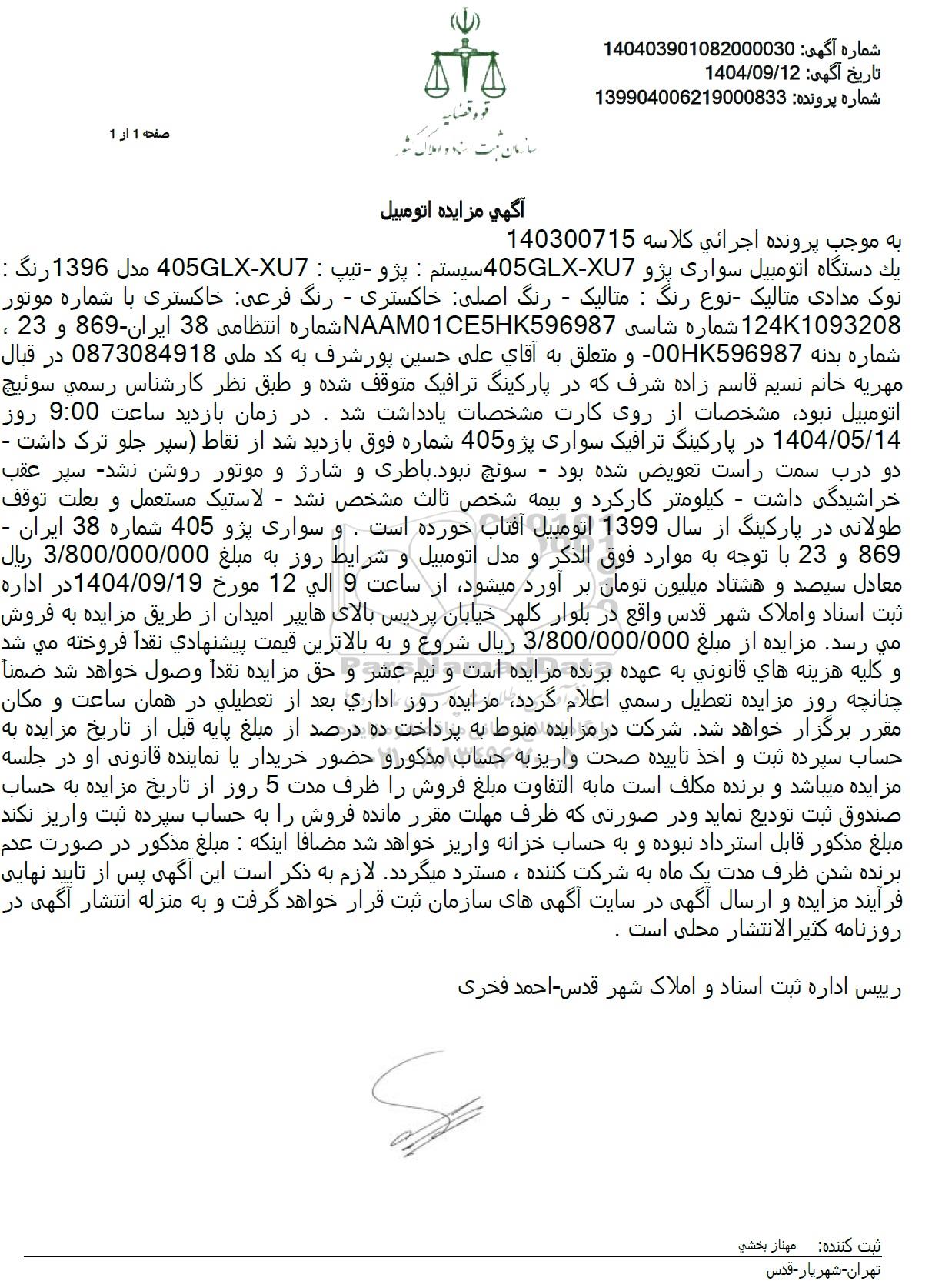 یک دستگاه اتومبیل سواری پژو 405GLX-XU7 سیستم : پژو - تیپ : 405GLX-XU7 مدل 1396 رنگ : نوک مدادی متالیک نوع رنگ متالیک - رنگ اصلی خاکستری - رنگ فرعی خاکستری با شماره موتور 124K1093208 شماره شاسی NAAM01CE5HK596987 شماره انتظامی 38 ایران - 869 و 23 ، شماره بدنه 00HK596987 و متعلق به آقای على حسین پور شرف به کد ملی 0873084918 در قبال مهریه خانم نسیم قاسم زاده شرف که در پارکینگ ترافیک متوقف شده و طبق نظر کارشناس رسمی سوئیچ اتومبیل نبود مشخصات از روی کارت مشخصات یادداشت شد. در زمان بازدید ساعت 9:00 روز 1404.05.14 در پارکینگ ترافیک سواری پژو 405 شماره فوق بازدید شد از نقاط سپر جلو ترک داشت -دو درب سمت راست تعویض شده بود - سوئچ نبود باطری و شارژ و موتور روشن نشد سپر عقب خراشیدگی داشت - کیلومتر کارکرد و بیمه شخص ثالث مشخص نشد لاستیک مستعمل و بعلت توقف طولانی در پارکینگ از سال 1399 اتومبیل آفتاب خورده است . و سواری پژو 405 شماره 38 ایران -869 و 23 با توجه به موارد فوق الذکر و مدل اتومبیل و شرایط روز به مبلغ 3.800.000.000 ریال معادل سیصد و هشتاد میلیون تومان بر آورد میشود از ساعت 9 الی 12 مورخ 1404.09.19 در اداره ثبت اسناد و املاک شهر قدس واقع در بلوار کلهر خیابان پردیس بالای هایپر امیدان از طریق مزایده به فروش می رسد. مزایده از مبلغ 3.800.000.000 ریال شروع و به بالاترین قیمت پیشنهادی نقدا فروخته می شد و کلیه هزینه های قانونی به عهده برنده مزایده است و نیم عشر و حق مزایده نقداً وصول خواهد شد ضمنا چنانچه روز مزایده تعطیل رسمی اعلام گردد مزایده روز اداری بعد از تعطیلی در همان ساعت و مکان مقرر برگزار خواهد شد شرکت در مزایده منوط به پرداخت ده درصد از مبلغ پایه قبل از تاریخ مزایده به حساب سپرده ثبت و اخذ تاییده صحت واریز به حساب مذکور و حضور خریدار یا نماینده قانونی او در جلسه مزایده میباشد و برنده مکلف است ما به التفاوت مبلغ فروش را ظرف مدت 5 روز از تاریخ مزایده به حساب صندوق ثبت تودیع نماید و در صورتی که ظرف مهلت مقرر مانده فروش را به حساب سپرده ثبت واریز نکند مبلغ مذکور قابل استرداد نبوده و به حساب خزانه واریز خواهد شد مضافا اینکه : مبلغ مذکور در صورت عدم برنده شدن ظرف مدت یک ماه به شرکت کننده ، مسترد میگردد. لازم به ذکر است این آگهی پس از تایید نهایی فرآیند مزایده و ارسال آگهی در سایت آگهی های سازمان ثبت قرار خواهد گرفت و به منزله انتشار آگهی در روزنامه کثیر الانتشار محلی است.