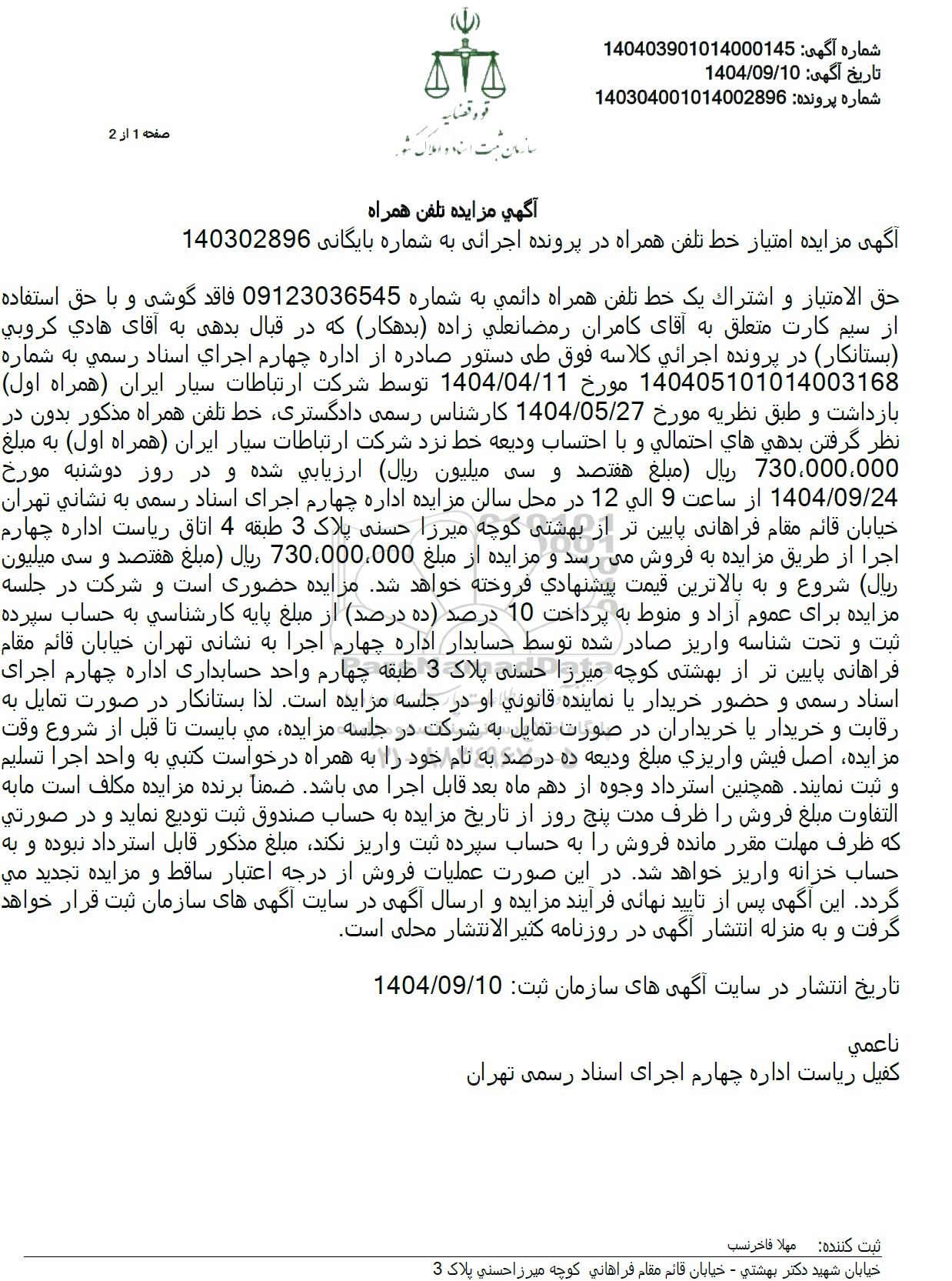 حق الامتیاز و اشتراک یک خط تلفن همراه دائمی به شماره 09123036545 فاقد گوشی و با حق استفاده از سیم کارت متعلق به آقای کامران رمضانعلی زاده (بدهکار) که در قبال بدهی به آقای هادي کروبي بستانکار در پرونده اجرائي كلاسه فوق طی دستور صادره از اداره چهارم اجرای اسناد رسمی به شماره 140405101014003168 مورخ 1404.04.11 توسط شرکت ارتباطات سیار ایران همراه اول بازداشت و طبق نظریه مورخ 1404.05.27 کارشناس رسمی دادگستری خط تلفن همراه مذکور بدون در نظر گرفتن بدهي هاي احتمالي و با احتساب ودیعه خط نزد شرکت ارتباطات سیار ایران همراه اول به مبلغ 730,000,000 ريال (مبلغ هفتصد و سی میلیون ریال ارزیابی شده و در روز دوشنبه مورخ 1404.09.24 از ساعت 9 الی 12 در محل سالن مزایده اداره چهارم اجرای اسناد رسمی به نشانی تهران خیابان قائم مقام فراهانی پایین تر از بهشتی کوچه میرزا حسنی پلاک 3 طبقه 4 اتاق ریاست اداره چهارم اجرا از طریق مزایده به فروش میرسد و مزایده از مبلغ 730،000،000 ریال مبلغ هفتصد و سی میلیون ریال شروع و به بالاترین قیمت پیشنهادی فروخته خواهد شد مزایده حضوری است و شرکت در جلسه مزایده برای عموم آزاد و منوط به پرداخت 10 درصد ده درصد از مبلغ پایه کارشناسی به حساب سپرده ثبت و تحت شناسه واریز صادر شده توسط حسابدار اداره چهارم اجرا به نشانی تهران خیابان قائم مقام فراهانی پایین تر از بهشتی کوچه میرزا حسنی پلاک 3 طبقه چهارم واحد حسابداری اداره چهارم اجرای اسناد رسمی و حضور خریدار یا نماینده قانونی او در جلسه مزایده است. لذا بستانکار در صورت تمایل به رقابت و خریدار یا خریداران در صورت تمایل به شرکت در جلسه مزایده می بایست تا قبل از شروع وقت مزایده اصل فيش واريزي مبلغ ودیعه ده درصد به نام خود را به همراه درخواست کتبی به واحد اجرا تسلیم و ثبت نمایند. همچنین استرداد وجوه از دهم ماه بعد قابل اجرا میباشد. ضمنا برنده مزایده مکلف است ما به التفاوت مبلغ فروش را ظرف مدت پنج روز از تاریخ مزایده به حساب صندوق ثبت تودیع نماید و در صورتي که ظرف مهلت مقرر مانده فروش را به حساب سپرده ثبت واریز نکند مبلغ مذکور قابل استرداد نبوده و به حساب خزانه واریز خواهد شد. در این صورت عملیات فروش از درجه اعتبار ساقط و مزایده تجديد مي گردد. این آگهی پس از تایید نهایی فرآیند مزایده و ارسال آگهی در سایت آگهی های سازمان ثبت قرار خواهد گرفت و به منزله انتشار آگهی در روزنامه کثیر الانتشار محلی است.