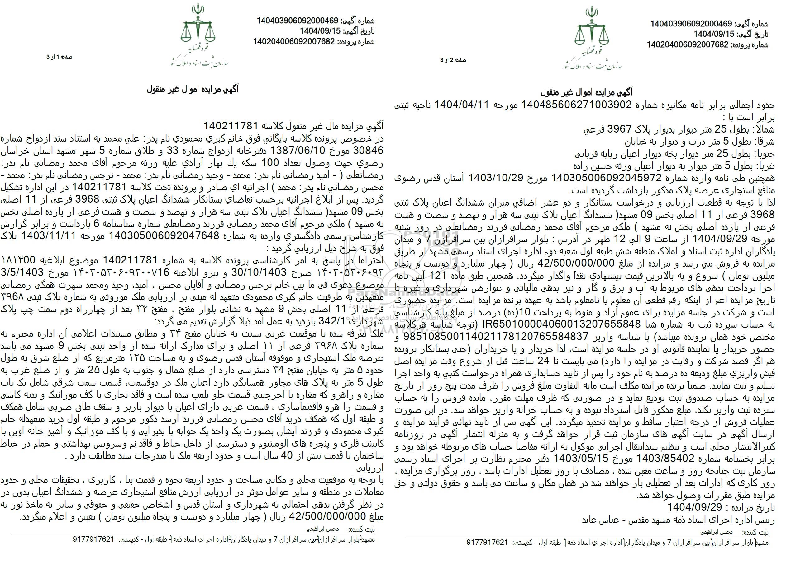 آگهی مزایده مال غیرمنقول کلاسه 140211781