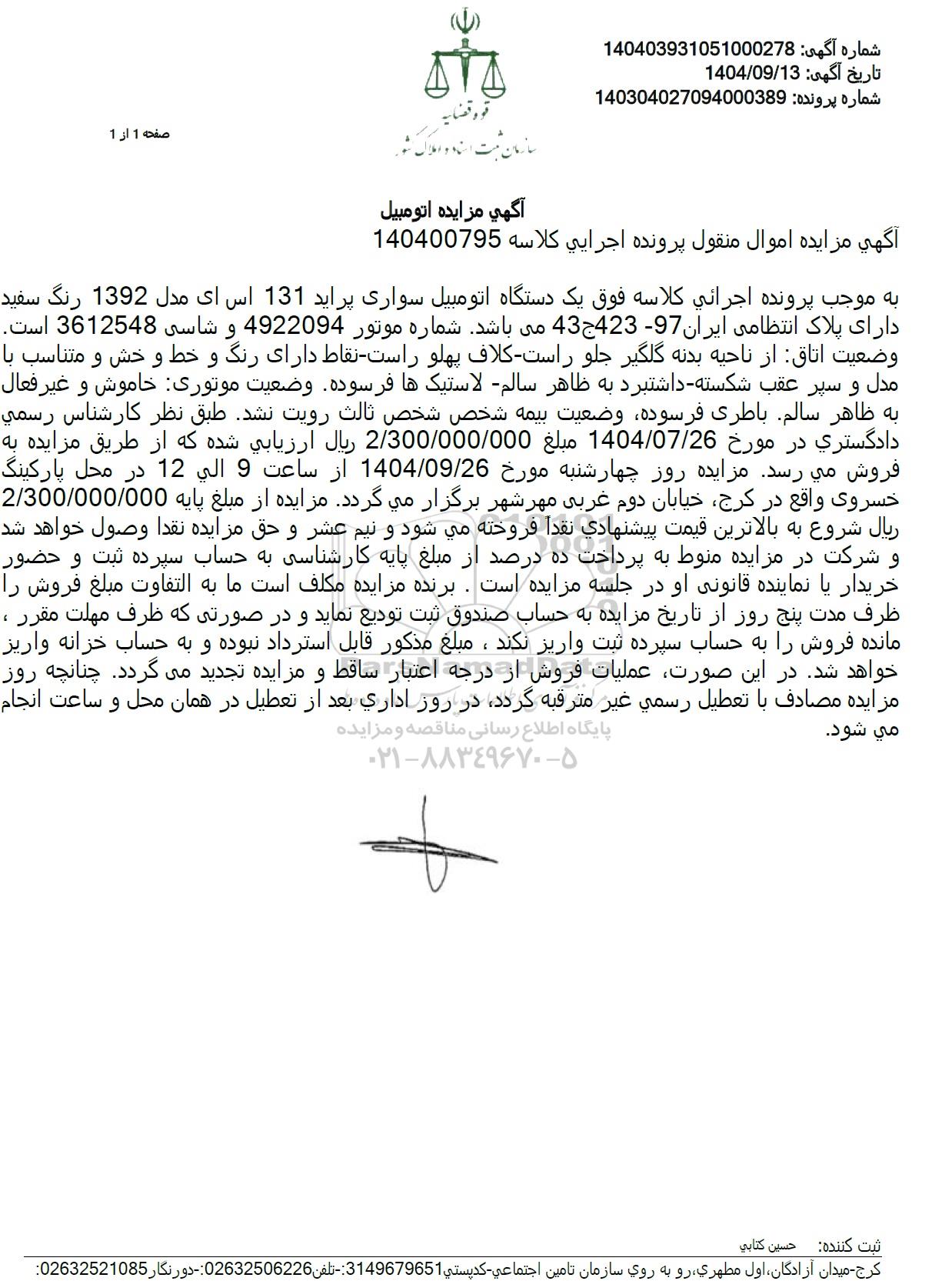 آگهی مزایده اموال منقول پرونده اجرایی کلاسه 140400795 به موجب پرونده اجرائی کلاسه فوق یک دستگاه اتومبیل سواری پراید 131 اس ای مدل 1392 رنگ سفید دارای پلاک انتظامی ایران 97 43423 می باشد شماره موتور 4922094 و شاسی 3612548 است. وضعیت اتاق از ناحیه بدنه گلگیر جلو راست کلاف پهلو راست نقاط دارای رنگ و خط و خش و متناسب با مدل و سپر عقب شکسته داشتبرد به ظاهر سالم - لاستیک ها فرسوده وضعیت موتوری خاموش و غیر فعال به ظاهر سالم باطری فرسوده وضعیت بیمه شخص شخص ثالث رویت نشد طبق نظر کارشناس رسمي دادگستری در مورخ 1404.07.26 مبلغ 2.300.000.000 ریال ارزيابي شده که از طریق مزایده به فروش میرسد مزایده روز چهارشنبه مورخ 1404.09.26 از ساعت 9 الی 12 در محل پارکینگ خسروی واقع در کرج خیابان دوم غربی مهرشهر برگزار میگردد. مزایده از مبلغ پایه 2.300.000.000 ریال شروع به بالاترین قیمت پیشنهادی نقدا فروخته میشود و نیم عشر و حق مزایده نقدا وصول خواهد شد و شرکت در مزایده منوط به پرداخت ده درصد از مبلغ پایه کارشناسی به حساب سپرده ثبت و حضور خریدار یا نماینده قانونی او در جلسه مزایده است. برنده مزایده مکلف است ما به التفاوت مبلغ فروش را ظرف مدت پنج روز از تاریخ مزایده به حساب صندوق ثبت تودیع نماید و در صورتی که ظرف مهلت مقرر ، مانده فروش را به حساب سپرده ثبت واریز نکند، مبلغ مذکور قابل استرداد نبوده و به حساب خزانه واریز خواهد شد. در این صورت عملیات فروش از درجه اعتبار ساقط و مزایده تجدید می گردد. چنانچه روز مزایده مصادف با تعطیل رسمی غير مترقبه ،گردد در روز اداری بعد از تعطیل در همان محل و ساعت انجام می شود.