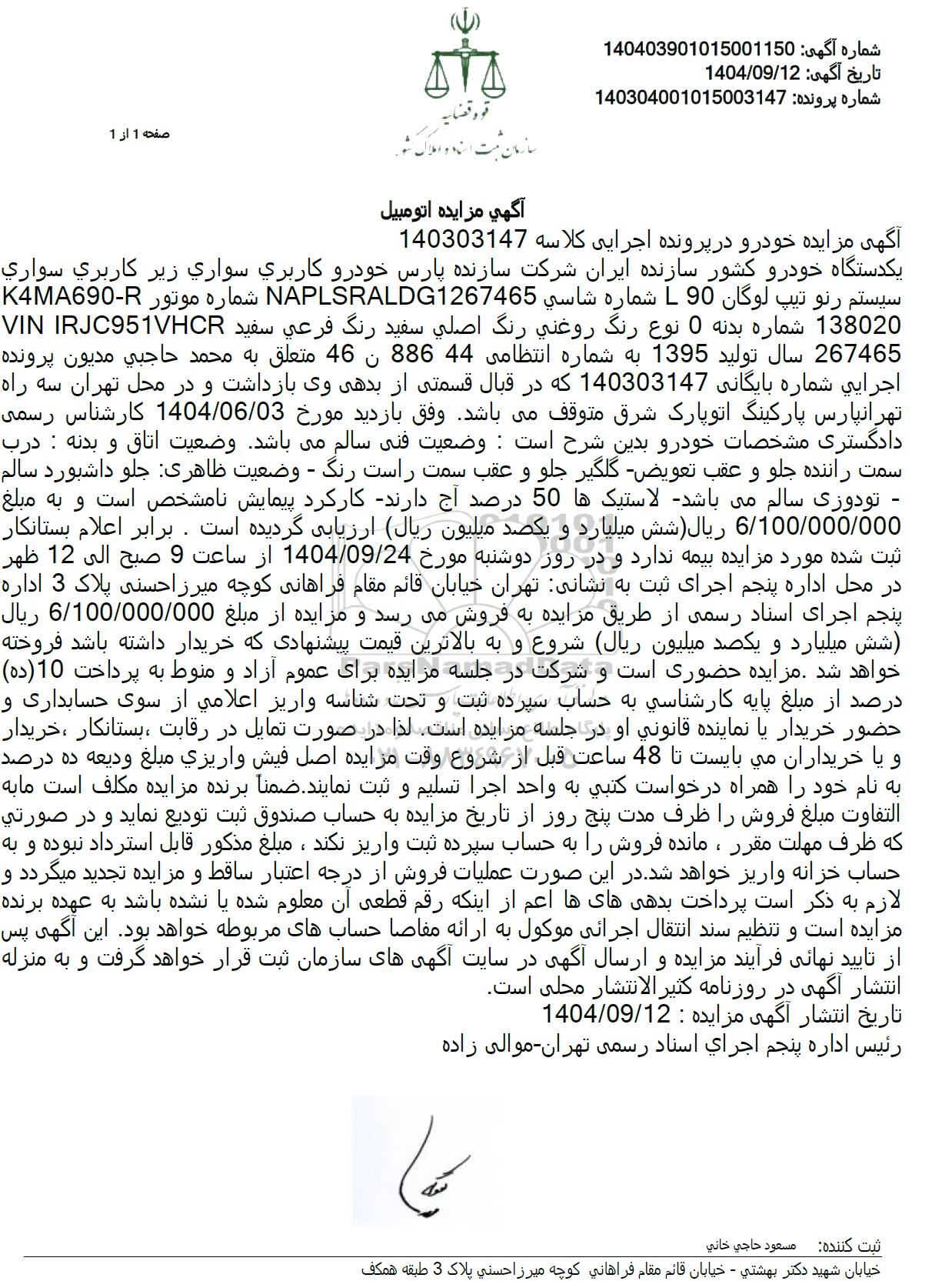یک دستگاه خودرو کشور سازنده ایران شرکت سازنده پارس خودرو کاربری سواری زیر کاربری سواری سیستم رنو تیپ لوگان L90 شماره شاسی NAPLSRALDG1267465 شماره موتور K4MA690-R 138020 شماره بدنه 0 نوع رنگ روغنی رنگ اصلی سفید رنگ فرعی سفید VIN IRJC951VHCR 267465 سال تولید 1395 به شماره انتظامی 88644 ن 46 متعلق به محمد حاجبی مدیون پرونده اجرایی شماره بایگانی 140303147 که در قبال قسمتی از بدهی وی بازداشت و در محل تهران سه راه تهرانپارس پارکینگ اتو پارک شرق متوقف می باشد وفق بازدید مورخ 1404.06.03 کارشناس رسمی دادگستری مشخصات خودرو بدین شرح است: وضعیت فنی سالم میباشد وضعیت اتاق و بدنه : درب سمت راننده جلو و عقب تعویض گلگیر جلو و عقب سمت راست رنگ - وضعیت ظاهری جلو داشبورد سالم تودوزی سالم می باشد لاستیکها 50 درصد آج دارند کار کرد پیمایش نامشخص است و به مبلغ 6.100.000.000 ریال شش میلیارد و یکصد میلیون ریال ارزیابی گردیده است. برابر اعلام بستانکار ثبت شده مورد مزایده بیمه ندارد و در روز دوشنبه مورخ 1404.09.24 از ساعت 9 صبح الى 12 ظهر در محل اداره پنجم اجرای ثبت به نشانی تهران خیابان قائم مقام فراهانی کوچه میرزاحسنی پلاک 3 اداره پنجم اجرای اسناد رسمی از طریق مزایده به فروش میرسد و مزایده از مبلغ 6.100.000.000 ریال شش میلیارد و یکصد میلیون ریال شروع و به بالاترین قیمت پیشنهادی که خریدار داشته باشد فروخته خواهد شد. مزایده حضوری است و شرکت در جلسه مزایده برای عموم آزاد و منوط به پرداخت 10 (ده) درصد از مبلغ پایه کارشناسی به حساب سپرده ثبت و تحت شناسه واریز اعلامی از سوی حسابداری و حضور خریدار یا نماینده قانونی او در جلسه مزایده است. لذا در صورت تمایل در رقابت ، بستانکار ، خریدار و یا خریداران می بایست تا 48 ساعت قبل از شروع وقت مزایده اصل فیش واریزی مبلغ ودیعه ده درصد به نام خود را همراه درخواست کتبی به واحد اجرا تسلیم و ثبت نمایند. ضمناً برنده مزایده مکلف است ما به التفاوت مبلغ فروش را ظرف مدت پنج روز از تاریخ مزایده به حساب صندوق ثبت تودیع نماید و در صورتی که ظرف مهلت مقرر ، مانده فروش را به حساب سپرده ثبت واریز نکند، مبلغ مذکور قابل استرداد نبوده و به حساب خزانه واریز خواهد شد. در این صورت عملیات فروش از درجه اعتبار ساقط و مزایده تجدید میگردد و لازم به ذکر است پرداخت بدهیهایها اعم از اینکه رقم قطعی آن معلوم شده یا نشده باشد به عهده برنده مزایده است و تنظیم سند انتقال اجرائی موکول به ارائه مفاصا حسابهای مربوطه خواهد بود. این آگهی پس از تایید نهایی فرآیند مزایده و ارسال آگهی در سایت آگهی های سازمان ثبت قرار خواهد گرفت و به منزله انتشار آگهی در روزنامه کثیر الانتشار محلی است.