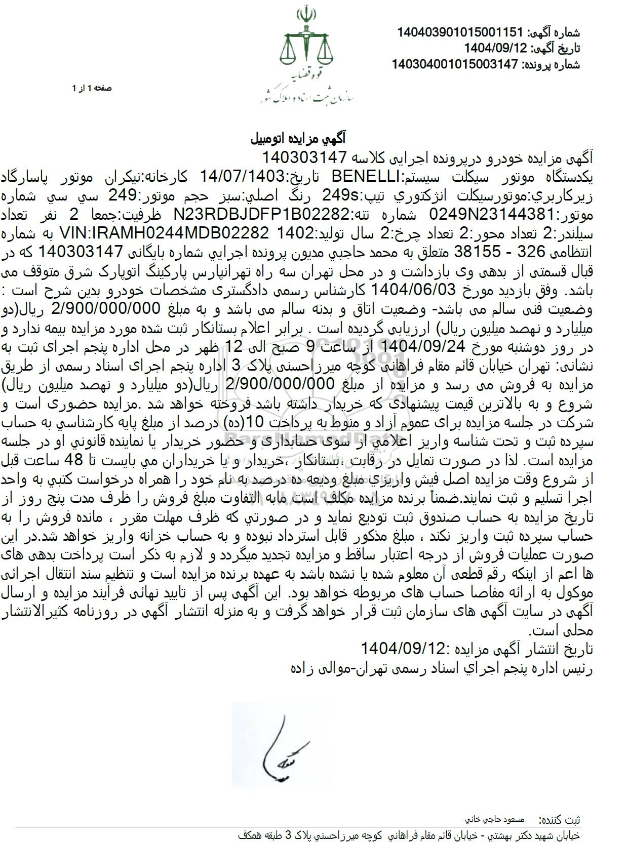یک دستگاه موتور سیکلت سیستم BENELLI تاریخ : 14.07.1403 کارخانه نیکران موتور پاسارگاد زیر کاربری موتور سیکلت انژکتوری تیپ 2495 رنگ اصلی سبز حجم موتور : 249 سی سی شماره موتور : 024923144381 شماره تنه : N23RDBJDFP1B02282 ظرفیت : جمعا 2 نفر تعداد سیلندر : 2 تعداد محور 2 تعداد چرخ 2 سال تولید : 1402 VIN IRAMH0244MDB02282 به شماره انتظامی 326 - 38155 متعلق به محمد حاجبی مدیون پرونده اجرایی شماره بایگانی 140303147 که در قبال قسمتی از بدهی وی بازداشت و در محل تهران سه راه تهرانپارس پارکینگ اتوپارک شرق متوقف می باشد وفق بازدید مورخ 1404.06.03 کارشناس رسمی دادگستری مشخصات خودرو بدین شرح است : وضعیت فنی سالم میباشد وضعیت اتاق و بدنه سالم میباشد و به مبلغ 2.900.000.000 ریال (دو میلیارد و نهصد میلیون ریال ارزیابی گردیده است. برابر اعلام بستانکار ثبت شده مورد مزایده بیمه ندارد و در روز دوشنبه مورخ 1404.09.24 از ساعت 9 صبح الی 12 ظهر در محل اداره پنجم اجرای ثبت به نشانی: تهران خیابان قائم مقام فراهانی کوچه میرزاحسنی پلاک 3 اداره پنجم اجرای اسناد رسمی از طریق مزایده به فروش میرسد و مزایده از مبلغ 2.900.000.000 ریال دو میلیارد و نهصد میلیون ریال شروع و به بالاترین قیمت پیشنهادی که خریدار داشته باشد فروخته خواهد شد. مزایده حضوری است و شرکت در جلسه مزایده برای عموم آزاد و منوط به پرداخت (10 (ده) درصد از مبلغ پایه کارشناسی به حساب سپرده ثبت و تحت شناسه واریز اعلامی از سوی حسابداری و حضور خریدار یا نماینده قانونی او در جلسه مزایده است. لذا در صورت تمایل در رقابت ، بستانکار ، خریدار و یا خریداران می بایست تا 48 ساعت قبل از شروع وقت مزایده اصل فیش واریزی مبلغ ودیعه ده درصد به نام خود را همراه درخواست کتبی به واحد اجرا تسلیم و ثبت نمایند. ضمناً برنده مزایده مکلف است ما به التفاوت مبلغ فروش را ظرف مدت پنج روز از تاریخ مزایده به حساب صندوق ثبت تودیع نماید و در صورتی که ظرف مهلت مقرر ، مانده فروش را به حساب سپرده ثبت واریز نکند ، مبلغ مذکور قابل استرداد نبوده و به حساب خزانه واریز خواهد شد. در این صورت عملیات فروش از درجه اعتبار ساقط و مزایده تجدید میگردد و لازم به ذکر است پرداخت بدهی های ها اعم از اینکه رقم قطعی آن معلوم شده یا نشده باشد به عهده برنده مزایده است و تنظیم سند انتقال اجرائی موکول به ارائه مفاصا حسابهای مربوطه خواهد بود این آگهی پس از تایید نهانی فرآیند مزایده و ارسال آگهی در سایت آگهی های سازمان ثبت قرار خواهد گرفت و به منزله انتشار آگهی در روزنامه کثیر الانتشار محلی است.