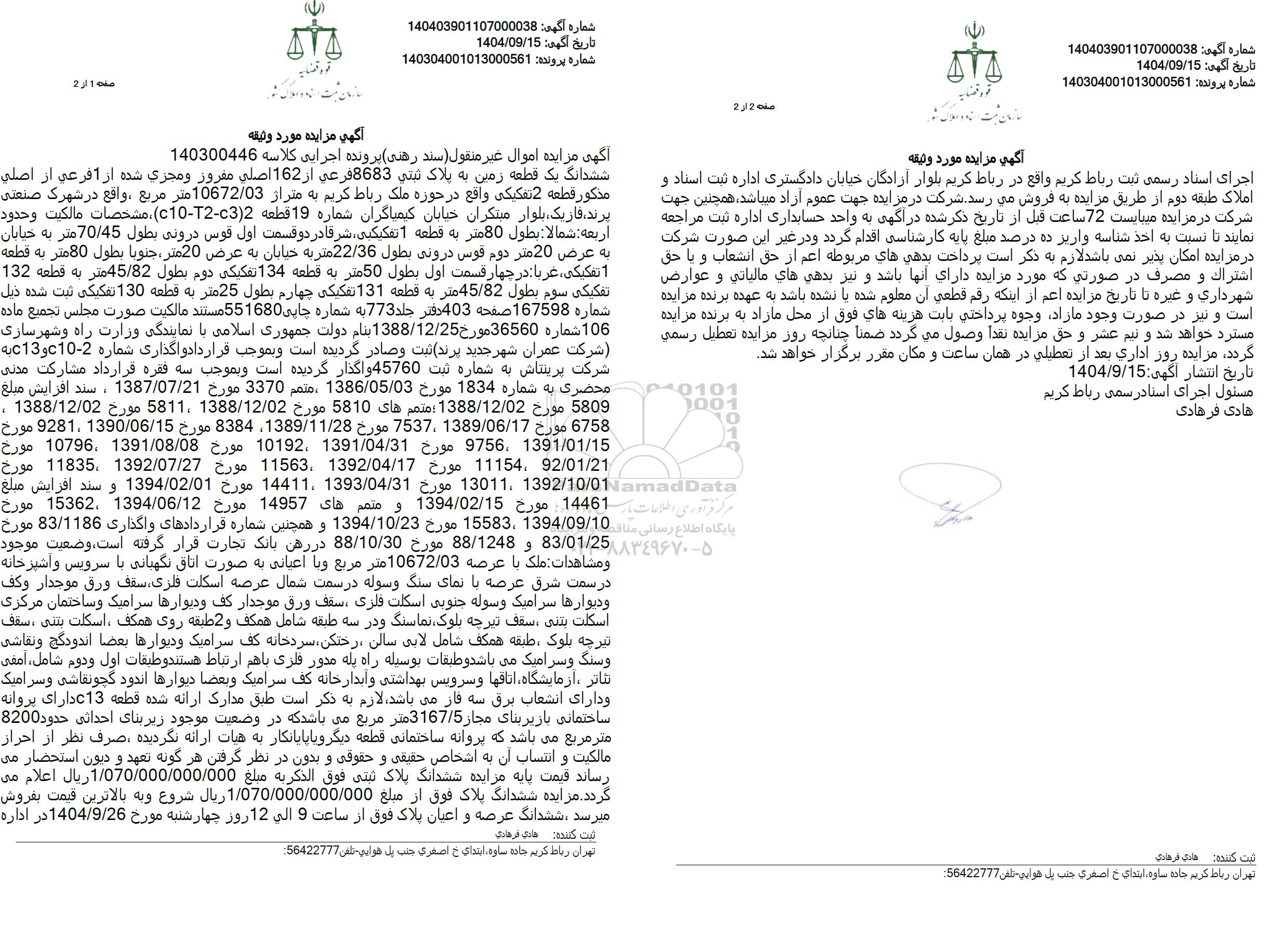 آگهی مزایده اموال غیر منقول سند رهنی پرونده اجرایی کلاسه 140300446 ششدانگ یک قطعه زمین به پلاک ثبتی 8683 فرعی از 162 اصلی مغرور و مجری شده از 1 فرعی از اصلی مذکور قطعه 2 تفکیکی واقع در حوزه ملک رباط کریم به متراز 10672.03 متر مربع ، واقع در شهرک صنعتی پرند فازیک بلوار مبتکران خیابان کیمیاگران شماره 19 قطعه 32-2-1) مشخصات مالكیت وحدود اربعة شمالا : بطول 80 متر به قطعه 1 تفکیکبی شرفا در دو قسمت اول قوس درونی بطول 70.45 متر به خیابان به عرض 20 متر دوم قوس درونی بطول 22.36 متر به خیابان به عرض 20 متر ، جنوبا بطول 80 متر به قطعه 1 تفکیکی، غربا در چهار قسمت اول بطول 50 متر به قطعه 134 تفكیكى دوم بطول 45.82 متر به قطعه 132 تفكیكی سوم بطول 45.82 متر به قطعه 131 تفکیکی چهارم بطول 25 متر به قطعه 130 تفکیکی ثبت شده ذیل شماره 167598 صفحه 403 دفتر جلد 773 به شماره چاپی 551680 مستند مالکیت صورت مجلس تجمیع ماده 106 شماره 36560 مورخ 1388.12.25 بنام دولت جمهوری اسلامی با نمایندگی وزارت راه و شهرسازی شرکت عمران شهر جدید برند ثبت و صادر گردیده است و بموجب قرارداد واگذاری شماره 2-C10 و 13 C به شرکت پرینتاش به شماره ثبت 45760 واگذار گردیده است و بموجب سه فقره قرارداد مشارکت مدنی محضری به شماره 1834 مورخ 1386.05.03 ، متمم 3370 مورخ 1387.07.21 ، سند افزایش مبلغ . 1388.12.02 5809 مورخ 1388.12.02 متمم های 5810 مورخ 1388.12.02 5811 مورخ 6758 مورخ 75371389.06.17 مورخ 1389.11.28 8384 مورخ 92811390.06.15 مورخ 1391.01.15 9756 مورخ 1391.04.31 10192 مورخ 1391.08.08 10796 مورخ 92.01.21 .11154 مورخ 1392.04.17 11563 مورخ 1392.07.27 11835 مورخ 1392.10.01 13011 مورخ 144111393.04.31 مورخ 1394.02.01 و سند افزایش مبلغ 14461 مورخ 1394.02.15 و متمم های 14957 مورخ 1394.06.12 15362 مورخ 1394.09.10 15583 مورخ 1394.10.23 و همچنین شماره قراردادهای واگذاری 83.1186 مورح83.01.25 و 88.1248 مورخ 88.10.30 در رهن بانک تجارت قرار گرفته است وضعیت موجود و مشاهدات ملک با عرصه 10672.03 متر مربع و با اعیانی به صورت اتاق نگهبانی با سرویس و آشپزخانه در سمت شرق عرصه با نمای سنگ و سوله در سمت شمال عرصه اسکلت فلزی سقف ورق موجدار وكف و دیوارها سرامیک و سوله جنوبی اسکلت فلزی سقف ورق موجدار کف و دیوارها سرامیک و ساختمان مرکزی اسكلت بتنى سقف تیرچه بلوک نماسنگ و در سه طبقه شامل همکف و 2 طبقه روی همکف ، اسکلت بتنی سقف تیرچه بلوک طبقه همکف شامل لابی سالن رختکن سردخانه کف سرامیک و دیوارها بعضا اندود گچ و نقاشی و سنگ و سرامیک می باشد و طبقات بوسیله راه پله مدور فلزی با هم ارتباط هستند و طبقات اول و دوم شامل، امفی تئاتر آزمایشگاه اتاقها و سرویس بهداشتی و آبدارخانه کف سرامیک و بعضا دیوارها اندود گچو نقاشی و سرامیک و دارای انشعاب برق سه فاز می باشد لازم به ذکر است طبق مدارک ارائه شده قطعه C13 دارای پروانه ساختمانی بازیربنای مجاز 3167.5 متر مربع می باشد که در وضعیت موجود زیربنای احداثی حدود 8200 متر مربع می باشد که پروانه ساختمانی قطعه دیگروپا پایانکار به هیات ارائه نگردیده صرف نظر از احرار مالکیت و انتساب آن به اشخاص حقیقی و حقوقی و بدون در نظر گرفتن هر گونه تعهد و دیون استحضار می رساند قیمت پایه مزایده ششدانگ پلاک ثبتی فوق الذكریة مبلغ 1.070.000.000.000 ریال اعلام می گردد. مزایده ششدانگ پلاک فوق از مبلغ 1.070.000.000.000 ریال شروع و به بالاترین قیمت بفروش میرسد ، ششدانگ عرصه و اعیان پلاک فوق از ساعت 9 الی 12 اجرای اسناد رسمی ثبت رباط کریم واقع در رباط کریم بلوار آزادگان خیابان دادگستری اداره ثبت اسناد و املاک طبقه دوم از طریق مزایده به فروش می رسد شرکت در مزایده جهت عموم آزاد میباشد. همچنین جهت شرکت در مزایده میبایست 72 ساعت قبل از تاریخ ذکر شده در آگهی به واحد حسابداری اداره ثبت مراجعه نمایند تا نسبت به اخذ شناسه واریز ده درصد مبلغ پایه کارشناسی اقدام گردد و در غیر این صورت شرکت در مزایده امکان پذیر نمی باشد لازم به ذکر است پرداخت بدهی های مربوطه اعم از حق انشعاب و یا حق اشتراك و مصرف در صورتی که مورد مزایده دارای آنها باشد و نیز بدهی های مالیاتی و عوارض شهرداری و غیره تا تاریخ مزایده اعم از اینکه رقم قطعی آن معلوم شده یا 