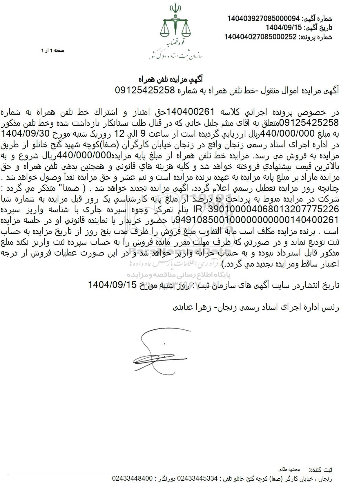 در خصوص پرونده اجرائی کلاسه 140400261 حق امتیاز و اشتراک خط تلفن همراه به شماره 09125425258 متعلق به آقای میثم جلیل خانی که در قبال طلب بستانکار بازداشت شده و خط تلفن مذکور به مبلغ 440.000.000 ریال ارزیابی گردیده است از ساعت 9 الی 12 روز یک شنبه مورخ 1404/09/30 در اداره اجرای اسناد رسمی زنجان واقع در زنجان خیابان کارگران (صفا) کوچه شهید گنج خانلو از طریق مزایده به فروش می رسد. مزایده خط تلفن همراه از مبلغ پایه مزایده 440.000.000 ریال شروع و به بالاترین قیمت پیشنهادی فروخته خواهد شد و کلیه هزینه های قانونی و همچنین بدهی تلفن همراه و حق مزایده مازاد بر مبلغ پایه مزایده به عهده برنده مزایده است و نیم عشر و حق مزایده نقداً وصول خواهد شد . چنانچه روز مزایده تعطیل رسمی اعلام گردد آگهی مزایده تجدید خواهد شد . ( ضمنا" متذکر می گردد : شرکت در مزایده منوط به پرداخت ده درصد از مبلغ پایه کارشناسی یک روز قبل مزایده به شماره شبا 390100004068013207775226 IR بنام تمرکز وجوه سپرده جاری با شناسه واریز سپرده 949108500100000000000140400261 با حضور خریدار یا نماینده قانونی او در جلسه مزایده است. برنده مزایده مکلف است ما به التفاوت مبلغ فروش را ظرف مدت پنج روز از تاریخ مزایده به حساب ثبت تودیع نماید و در صورتی که ظرف مهلت مقرر مانده فروش را به حساب سپرده ثبت واریز نکند مبلغ مذکور قابل استرداد نبوده و به حساب خزانه واریز خواهد شد و در این صورت عملیات فروش از درجه اعتبار ساقط و مزایده تجدید می گردد.