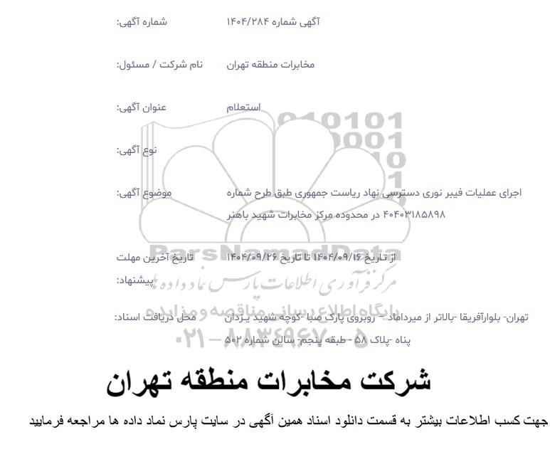 استعلام اجرای عملیات فیبر نوری دسترسی نهاد ریاست جمهوری, استعلام اجرای عملیات فیبر نوری دسترسی نهاد ریاست جمهوری
