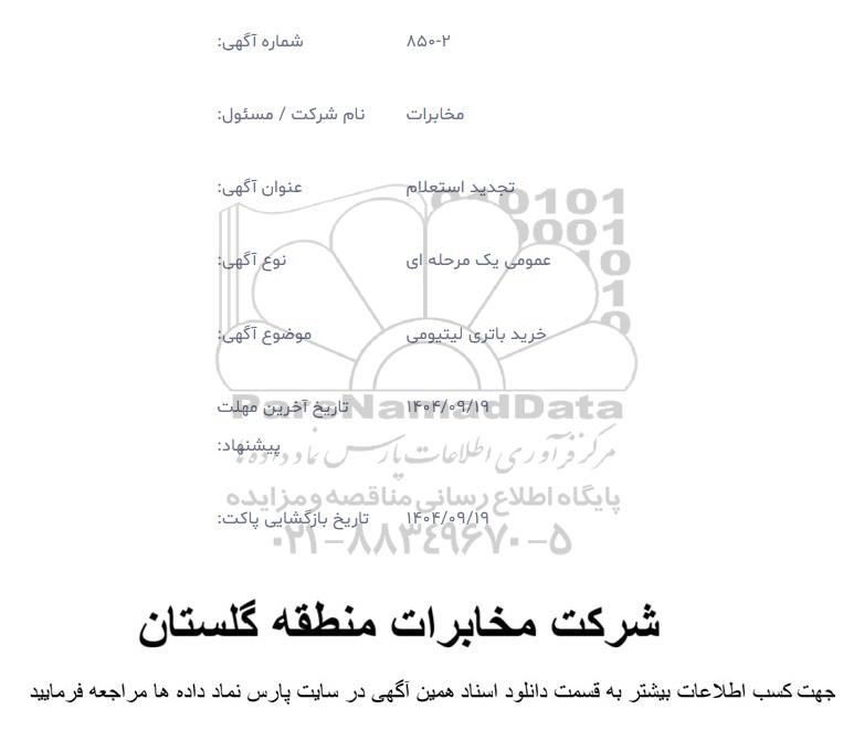 تجدید استعلام خرید باتری لیتیومی, تجدید استعلام خرید باتری لیتیومی