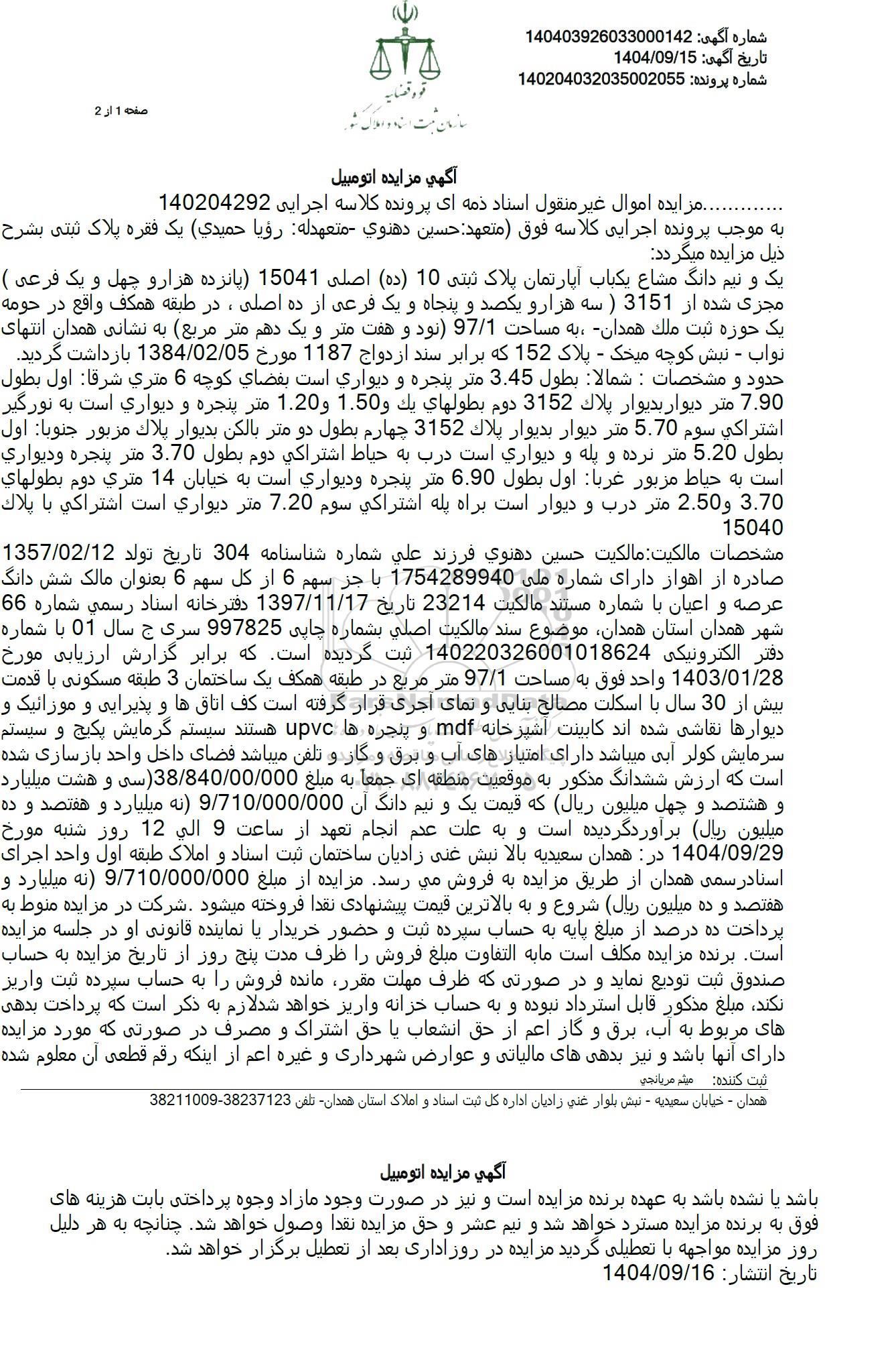 مشخصات مالکیت مالکیت حسین دهنوی فرزند علی شماره شناسنامه 304 تاریخ تولد 1357/02/12 صادره از اهواز دارای شماره ملی 1754289940 با جز سهم 6 از کل سهم 6 بعنوان مالک شش دانگ عرصه و اعیان با شماره مستند مالکیت 23214 تاریخ 1397.11.17 دفترخانه اسناد رسمی شماره 66 شهر همدان استان همدان موضوع سند مالکیت اصلی بشماره چاپی 997825 سری ج سال 01 با شماره دفتر الکترونیکی 140220326001018624 ثبت گردیده است که برابر گزارش ارزیابی مورخ 1403.01.28 واحد فوق به مساحت 97/1 متر مربع در طبقه همکف یک ساختمان 3 طبقه مسکونی با قدمت بیش از 30 سال با اسکلت مصالح بنایی و نمای آجری قرار گرفته است کف اتاقها و پذیرایی و موزائیک و دیوارها نقاشی شده اند کابینت آشپزخانه mdf و پنجره ها upvc هستند سیستم گرمایش پکیج و سیستم سرمایش کولر آبی میباشد دارای امتیازهای آب و برق و گاز و تلفن میباشد فضای داخل واحد بازسازی شده است که ارزش ششدانگ مذکور به موقعیت منطقه ای جمعا به مبلغ 38.840.00.000 سی و هشت میلیارد و هشتصد و چهل میلیون ریال که قیمت یک و نیم دانگ آن 9.710.000.000 نه میلیارد و هفتصد و ده میلیون ریال برآورد گردیده است و به علت عدم انجام تعهد از ساعت 9 الی 12 روز شنبه مورخ 1404.09.29 در همدان سعیدیه بالا نبش غنی زادیان ساختمان ثبت اسناد و املاک طبقه اول واحد اجرای اسناد رسمی همدان از طریق مزایده به فروش می رسد. مزایده از مبلغ 9.710.000.000 نه میلیارد و هفتصد و ده میلیون ریال شروع و به بالاترین قیمت پیشنهادی نقدا فروخته میشود . شرکت در مزایده منوط به پرداخت ده درصد از مبلغ پایه به حساب سپرده ثبت و حضور خریدار با نماینده قانونی او در جلسه مزایده است. برنده مزایده مکلف است ما به التفاوت مبلغ فروش را ظرف مدت پنج روز از تاریخ مزایده به حساب صندوق ثبت تودیع نماید و در صورتی که ظرف مهلت مقرر مانده فروش را به حساب سپرده ثبت واریز نکند مبلغ مذکور قابل استرداد نبوده و به حساب خزانه واریز خواهد شد لازم به ذکر است که پرداخت بدهی های مربوط به آب برق و گار اعم از حق انشعاب یا حق اشتراک و مصرف در صورتی که مورد مزایده دارای آنها باشد و نیز بدهیهای مالیاتی و عوارض شهرداری و غیره اعم از اینکه رقم قطعی آن باشد یا نشده باشد به عهده برنده مزایده است و نیز در صورت وجود مازاد وجوه پرداختی بابت هزینه های فوق به برنده مزایده مسترد خواهد شد و نیم عشر و حق مزایده نقدا وصول خواهد شد. چنانچه به هر دلیل روز مزایده مواجهه با تعطیلی گردید مزایده در روز اداری بعد از تعطیل برگزار خواهد شد.