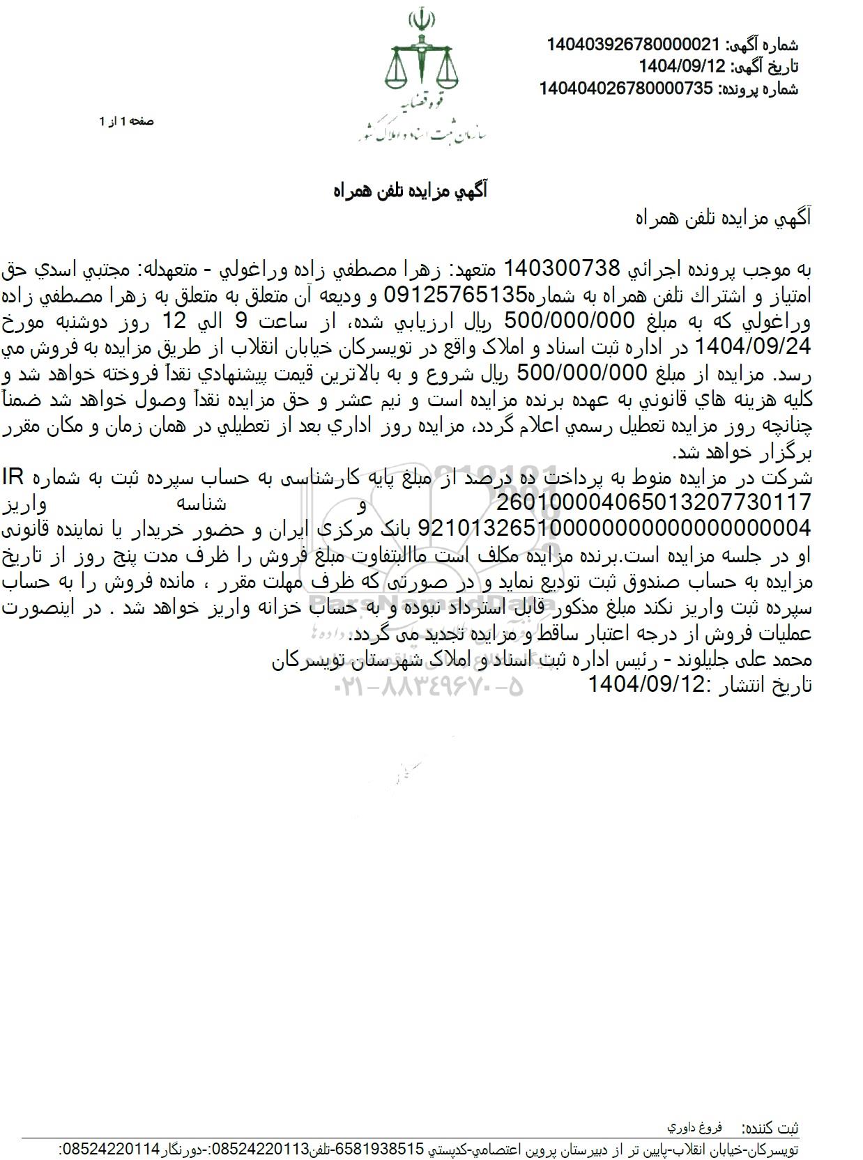 به موجب پرونده اجرائی 140300738 متعهد زهرا مصطفی زاده و راغولی - متعهدله : مجتبی اسدی حق امتیاز و اشتراک تلفن همراه به شماره 09125765135 و ودیعه آن متعلق به متعلق به زهرا مصطفی زاده وراغولی که به مبلغ 500.000.000 ریال ارزیابی شده از ساعت 9 الی 12 روز دوشنبه مورخ 1404.09.24 در اداره ثبت اسناد و املاک واقع در تویسرکان خیابان انقلاب از طریق مزایده به فروش می رسد. مزایده از مبلغ 500.000.000 ریال شروع و به بالاترین قیمت پیشنهادی نقدا فروخته خواهد شد و کلیه هزینه های قانونی به عهده برنده مزایده است و نیم عشر و حق مزایده نقداً وصول خواهد شد ضمنا چنانچه روز مزایده تعطیل رسمی اعلام گردد مزایده روز اداری بعد از تعطیلی در همان زمان و مکان مقرر برگزار خواهد شد.