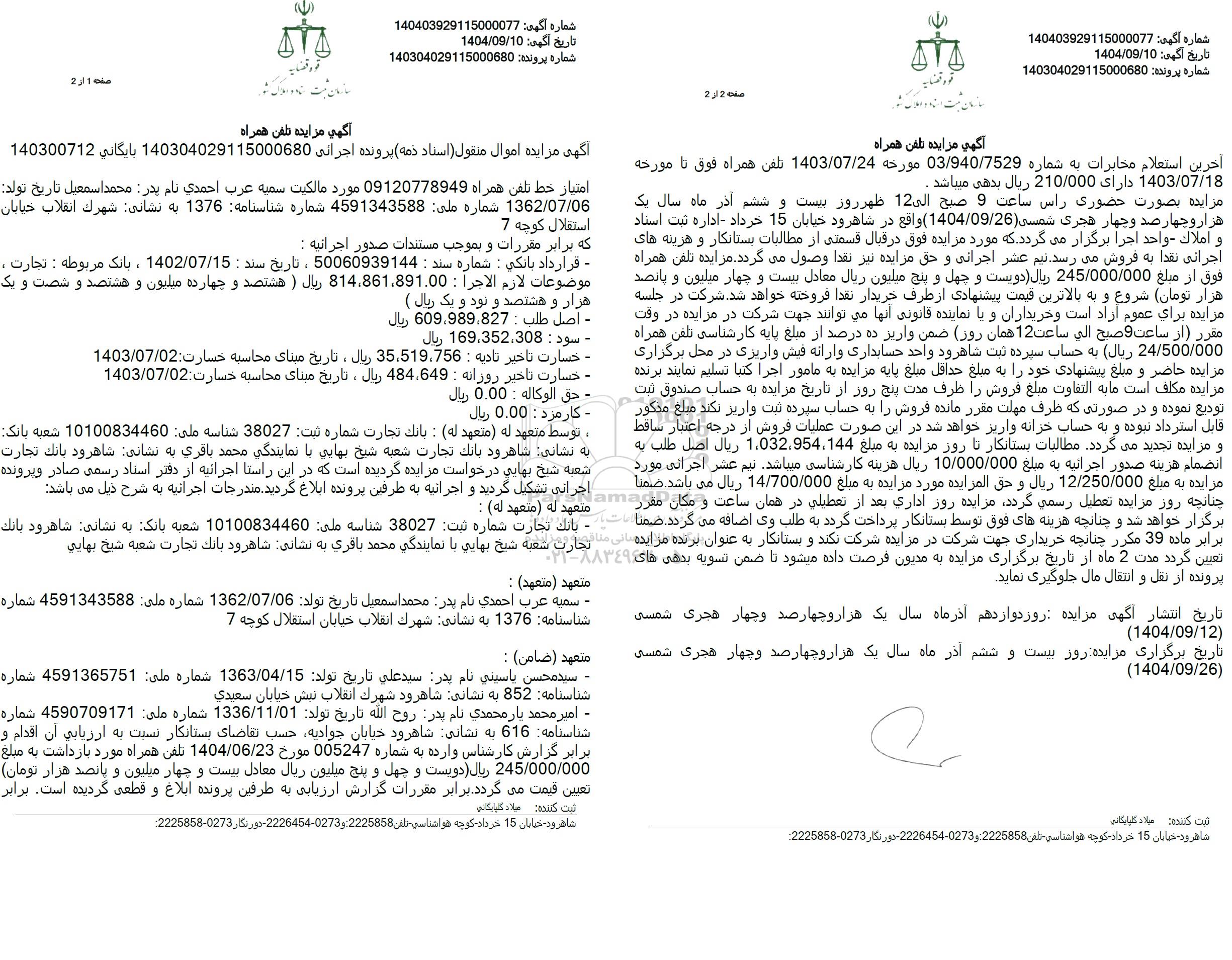 مزایده بصورت حضوری راس ساعت 9 صبح الى 12 ظهر روز بیست و ششم آذر ماه سال یک هزار و چهار صد و چهار هجری شمسی (1404.09.26) واقع در شاهرود خیابان 15 خرداد - اداره ثبت اسناد و املاك واحد اجرا برگزار میگردد که مورد مزایده فوق در قبال قسمتی از مطالبات بستانکار و هزینه های اجرائی نقدا به فروش میرسد. نیم عشر اجرائی و حق مزایده نیز نقدا وصول میگردد. مزایده تلفن همراه فوق از مبلغ 245/000/000 ریال ( دویست و چهل و پنج میلیون ریال معادل بیست و چهار میلیون و پانصد هزار تومان شروع و به بالاترین قیمت پیشنهادی از طرف خریدار نقدا فروخته خواهد شد. شرکت در جلسه مزایده برای عموم آزاد است و خریداران و یا نماینده قانونی آنها میتوانند جهت شرکت در مزایده در وقت مقرر از ساعت 9 صبحالی ساعت 12 همان روز) ضمن واریز ده درصد از مبلغ پایه کارشناسی تلفن همراه 245.000.000 ریال) به حساب سپرده ثبت شاهرود واحد حسابداری و ارائه فیش واریزی در محل برگزاری مزایده حاضر و مبلغ پیشنهادی خود را به مبلغ حداقل مبلغ پایه مزایده به مامور اجرا کتبا تسلیم نمایند برنده مزایده مکلف است ما به التفاوت مبلغ فروش را ظرف مدت پنج روز از تاریخ مزایده به حساب صندوق ثبت تودیع نموده و در صورتی که ظرف مهلت مقرر مانده فروش را به حساب سپرده ثبت واریز نکند مبلغ مذکور قابل استرداد نبوده و به حساب خزانه واریز خواهد شد در این صورت عملیات فروش از درجه اعتبار ساقط و مزایده تجدید می گردد. مطالبات بستانکار تا روز مزایده به مبلغ 144، 1,032,954 ریال به علاوه هزینه صدور اجرائيه و 10.000.000 ريال هزینه کارشناسی میباشد. نیم عشر اجرائی مورد مزایده به مبلغ 12.250.000 ريال و حق المزایده مورد مزایده به مبلغ 14.700.000 ریال می باشد. ضمنا چنانچه روز مزايده تعطيل رسمي گردد مزایده روز اداری بعد از تعطیلی در همان ساعت و مکان مقرر برگزار خواهد شد و چنانچه هزینه های فوق توسط بستانکار پرداخت گردد به طلب وی اضافه میگردد. ضمنا برابر ماده 39 مکرر چنانچه خریداری جهت شرکت در مزایده شرکت نکند و بستانکار به عنوان برنده مزایده تعیین گردد. مدت 2 ماه از تاریخ برگزاری مزایده به مدیون فرصت داده میشود تا ضمن تسویه بدهی های پرونده از نقل و انتقال مال جلوگیری نماید.