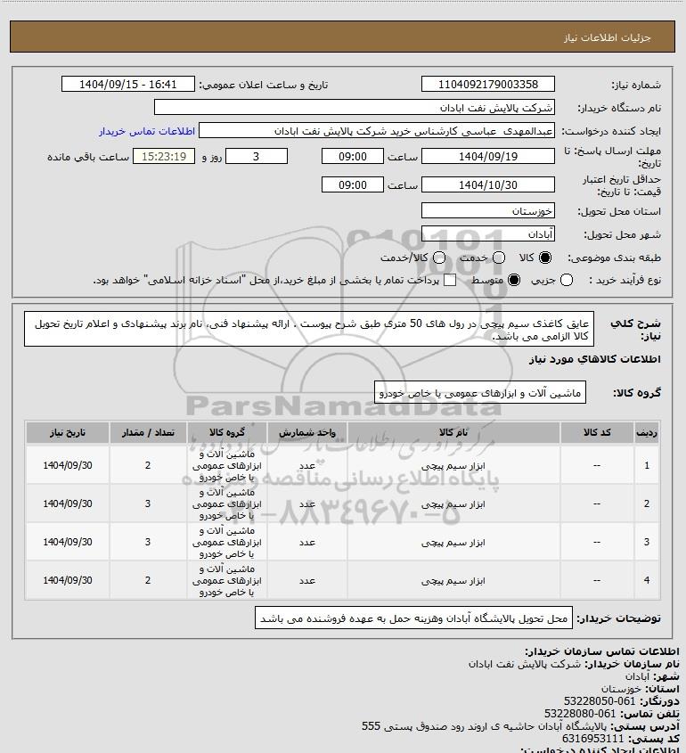 | 2 | -- | ابزار سیم پیچی | عدد | ماشین آلات و ابزارهای عمومی یا خاص خودرو | 3 | 1404/09/30 |