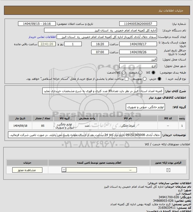 شرح کلی نیاز: کمیته امداد استان البرز در نظر دارد تعداد85 عدد کتری و قوری به شرح مشخصات خریداری نماید