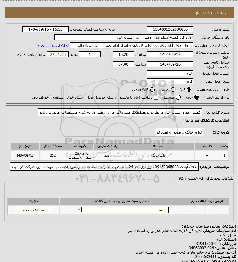 شرح کلی نیاز: کمیته امداد استان البرز در نظر دارد تعداد252 عدد ماگ حرارتی هیتر دار به شرح مشخصات خریداری نماید