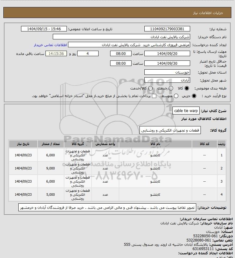 | 3 | -- | کابلشو | عدد | قطعات و تجهیزات الکتریکی و روشنایی | 6,000 | 1404/09/23 |
