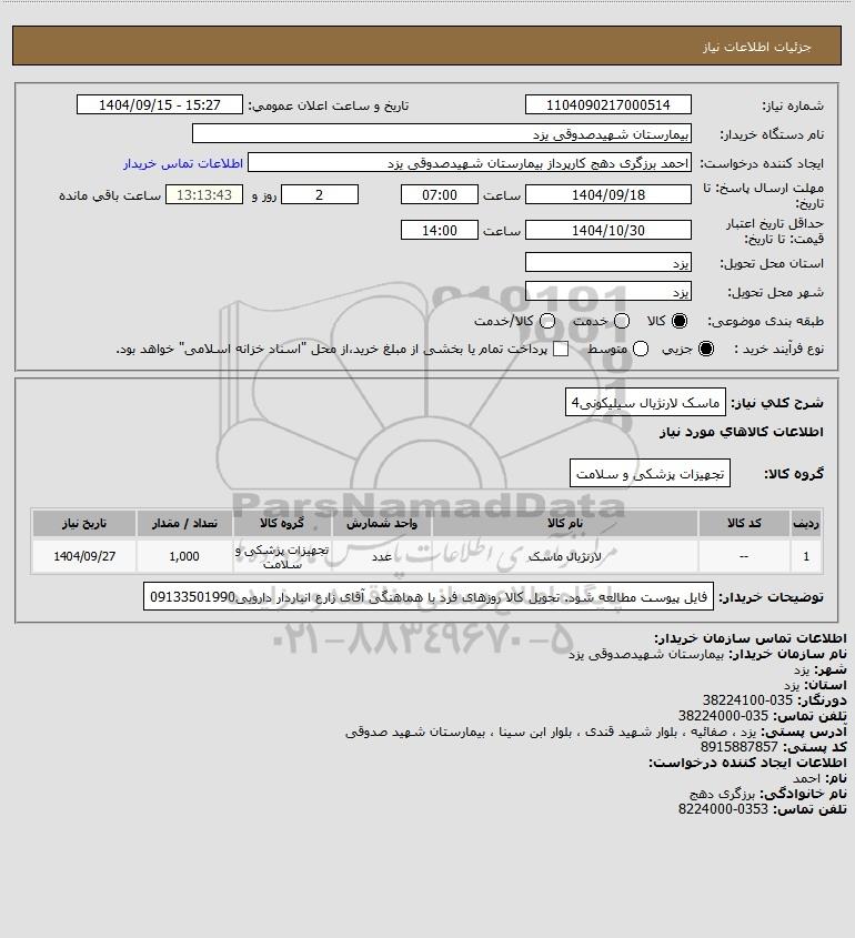 | 1 | -- | لارنژیال ماسک | عدد | تجهیزات پزشکی و سلامت | 1,000 | 1404/09/27 |