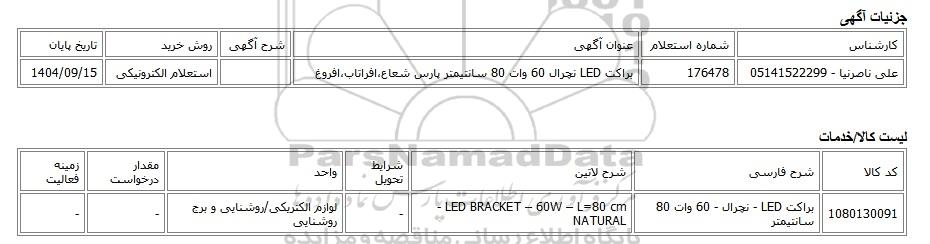 | علی ناصرنیا - 05141522299 | 176478 | براکت LED نچرال 60 وات 80 سانتیمتر پارس شعاع،افراتاب،افروغ | استعلام الکترونیکی | 1404/09/15 |