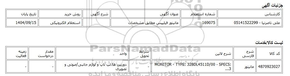 | علی ناصرنیا - 05141522299 | 169075 | مانیتور فیلیپس مطابق مشخصات | استعلام الکترونیکی | 1404/09/15 |
