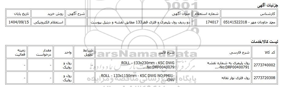 | محمد جاودان مهر - 05141522318 | 174017 | دو ردیف رول پلیمری و فلزی قطر133 مطابق نقشه و دیتیل پیوست | استعلام الکترونیکی | 1404/09/15 |