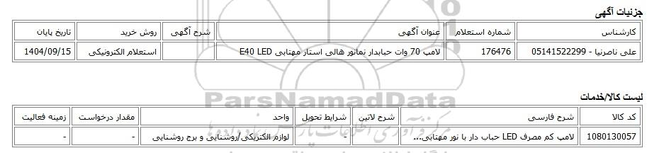 | علی ناصرنیا - 05141522299 | 176476 | لامپ 70 وات حبابدار نمانور هالی استار مهتابی E40 LED | استعلام الکترونیکی | 1404/09/15 |