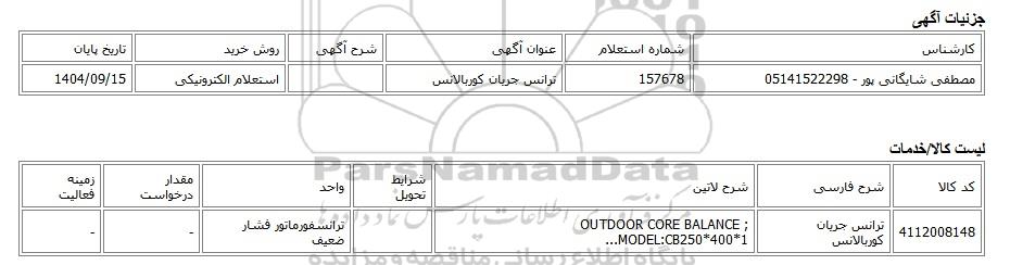 | مصطفی شایگانی پور - 05141522298 | 157678 | ترانس جریان کوربالانس | استعلام الکترونیکی | 1404/09/15 |