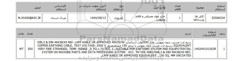 | 52506334 | کابل ها ورساناها | 1 | خرید مواد مصرفی و اقلام عمومی | کشوری | 1404/09/13 | مزدک اسدی | M.ASADI@KSC.IR |
