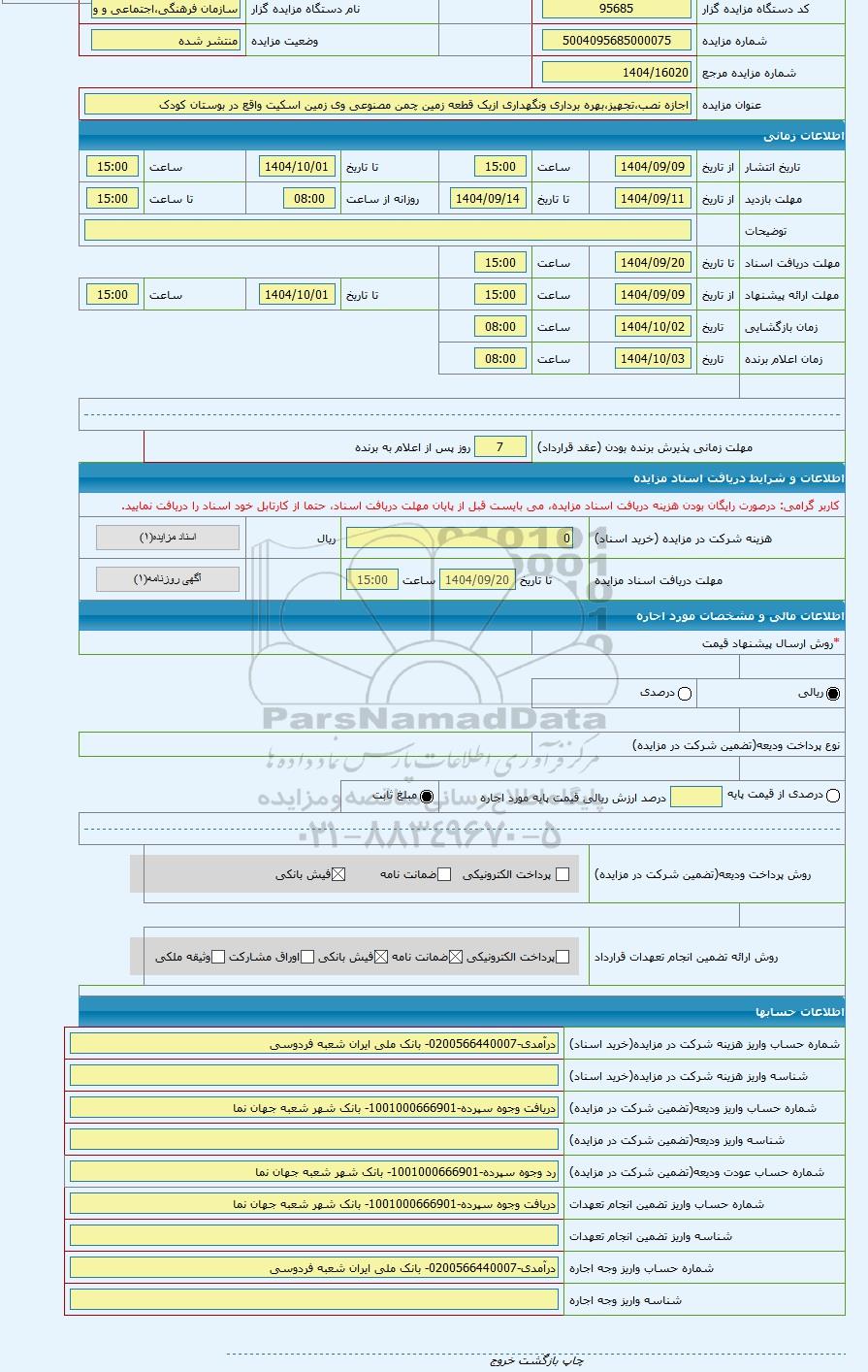 | شماره مورد اجاره | 5104095685000075 | نوع برگزاری مزایده | مزایده عمومی | |