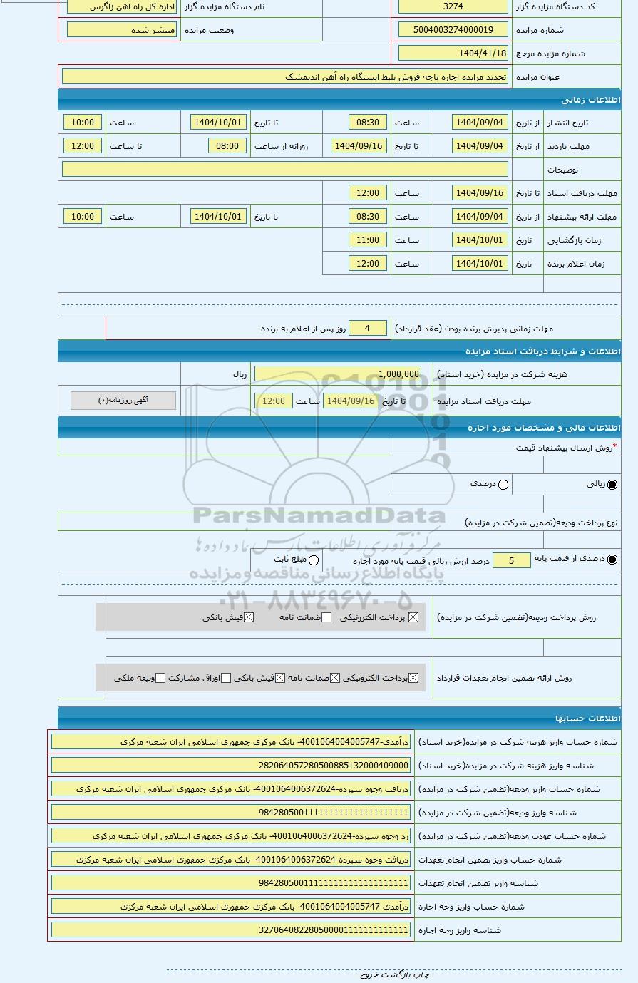 مزایده ، تجدید مزایده اجاره باجه فروش بلیط ایستگاه راه آهن اندیمشک