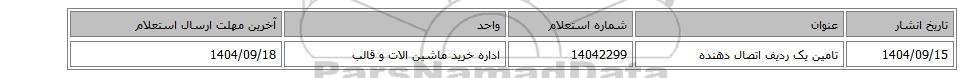 | 1404/09/15 | تامین یک ردیف اتصال دهنده | 14042299 | اداره خرید ماشین الات و قالب | 1404/09/18 |