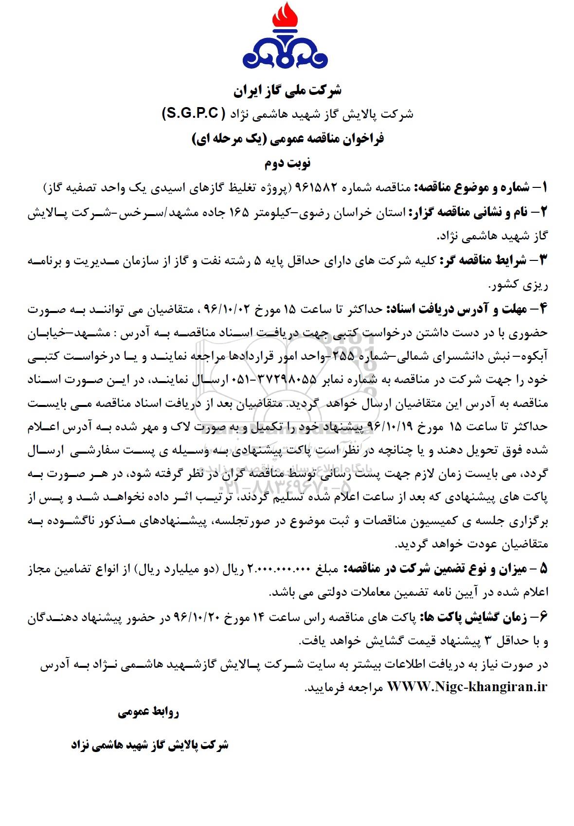 شماره و موضوع مناقصه مناقصه شماره 961582 پروژه تغلیظ گازهای اسیدی یک واحد تصفیه گاز